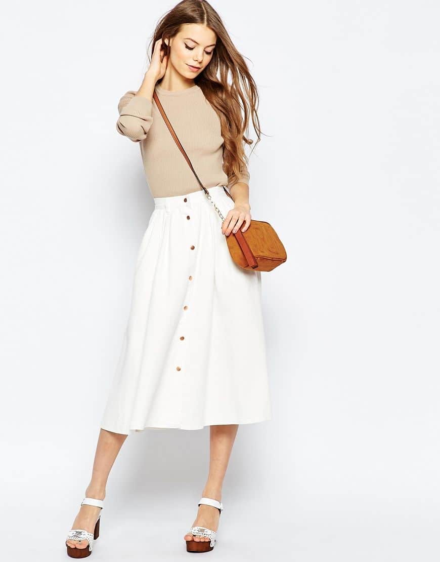 We will get a romantic look by combining a midi skirt below the knees with a sweater with a long sleeve. Your handbag will complement your outfit appropriately, and pick up the shoes relative to the weather, boots or sandals.