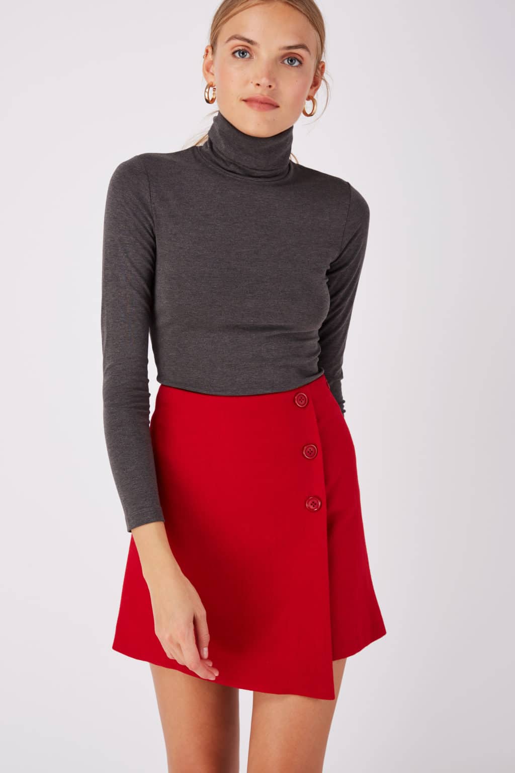In the summer, a mini skirt with buttons is perfectly combined with tops, t-shirts and blouses. But even in the cold season, fashionistas are in no hurry to part with her, dress her with turtlenecks and sweaters.