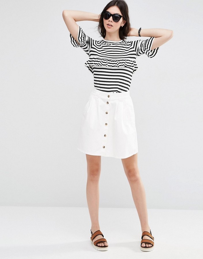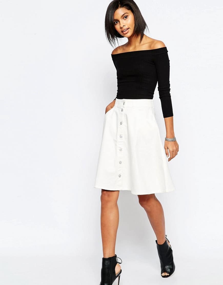 Also, for lovers of sports and casual style, a set of white denim skirts with a black T-shirt will be to their liking. Thus, it will be appropriate to choose white sneakers to maintain a sporty style.