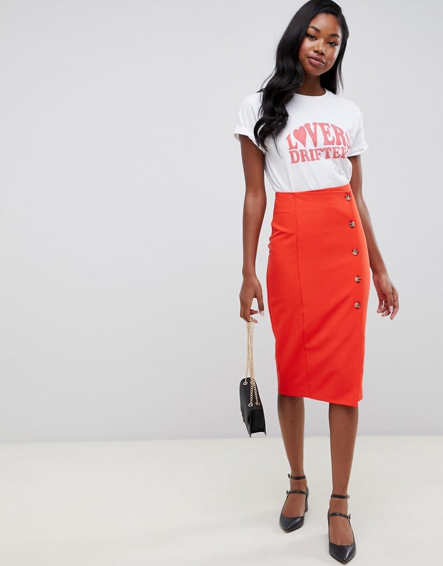 We will get a youth image by wearing a bright pencil skirt in combination with a T-shirt or top, and sneakers or ballet shoes.