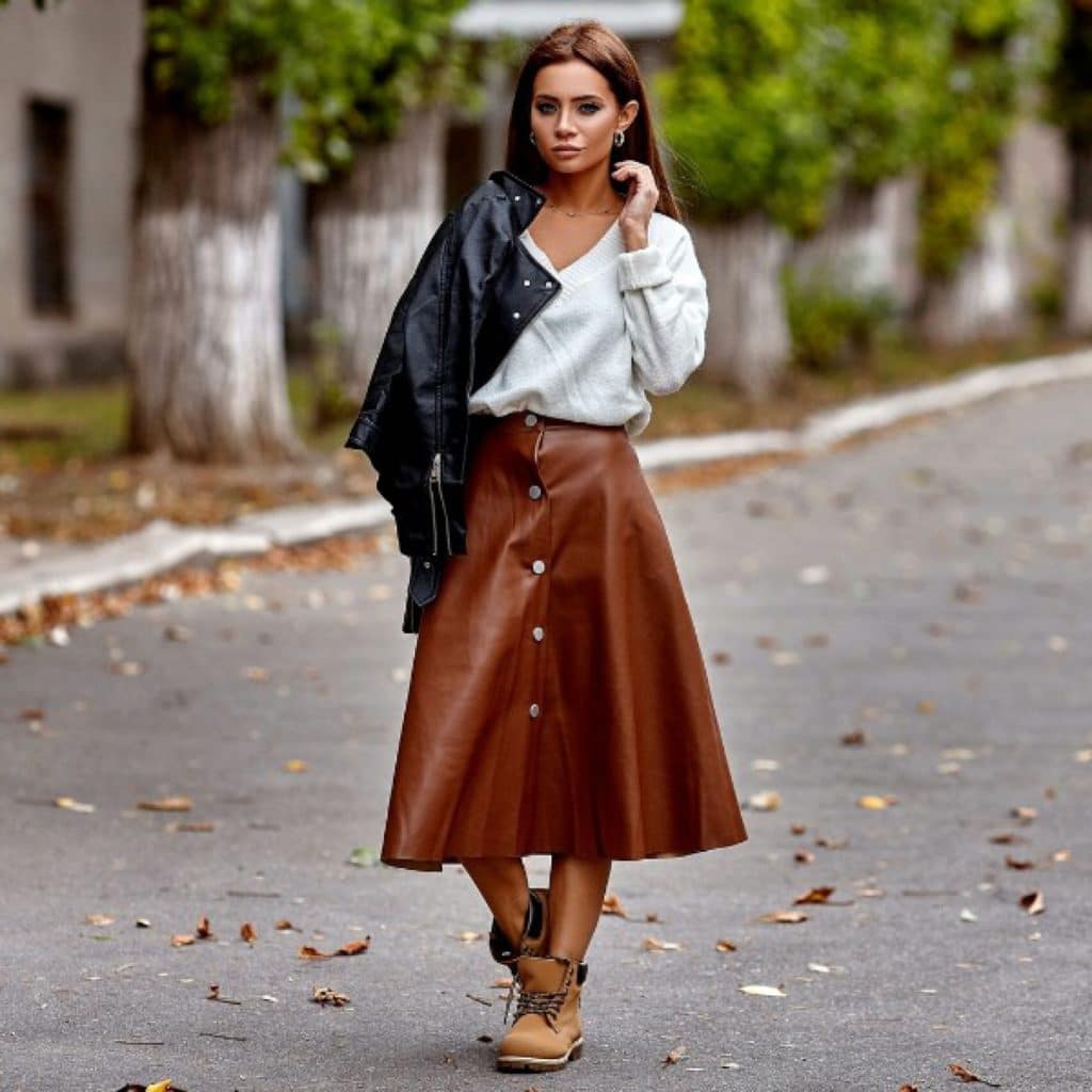 A stylish combination suitable for office style is a combination of a midi skirt with blouses or fitted shirts.