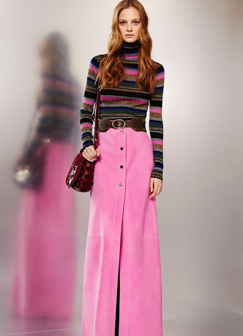 A warm suede long pink skirt will look good with a dark horizontal striped turtleneck.