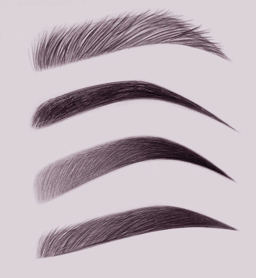 Arched eyebrows have a wide beginning, and the tip always ends with a long, sharp edge. Sometimes the tip may have a shorter tail, which does not spoil the image at all.