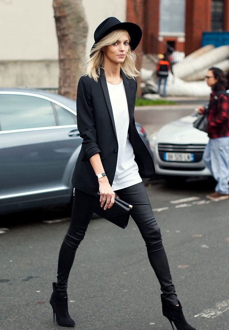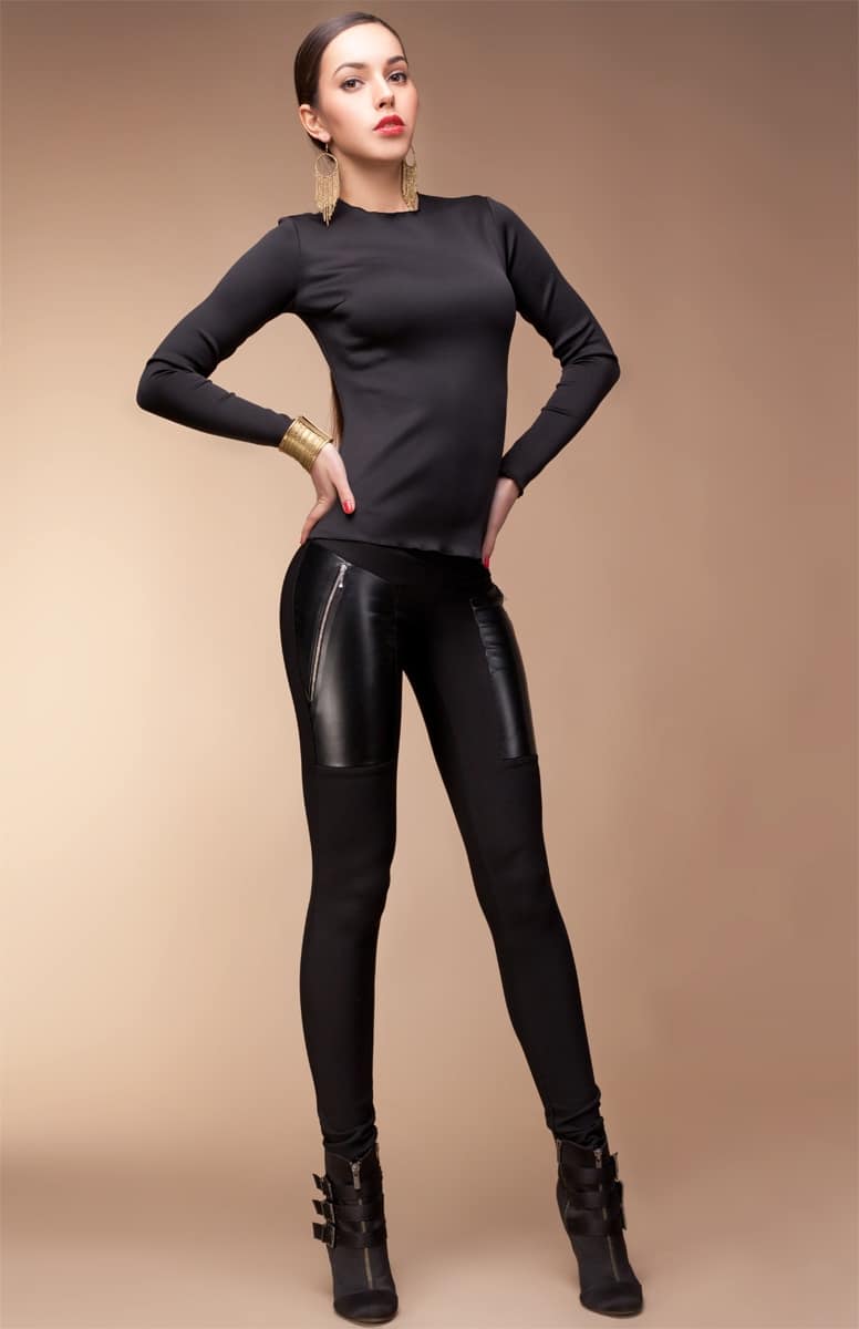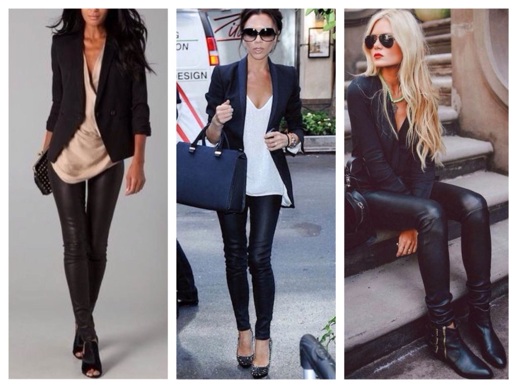 For slender girls, the choice of clothing for leggings is not limited. The combination of black leggings and a black turtleneck will be a very appealing, but at the same time stylish way. It is also possible to complement the image with a leather jacket.