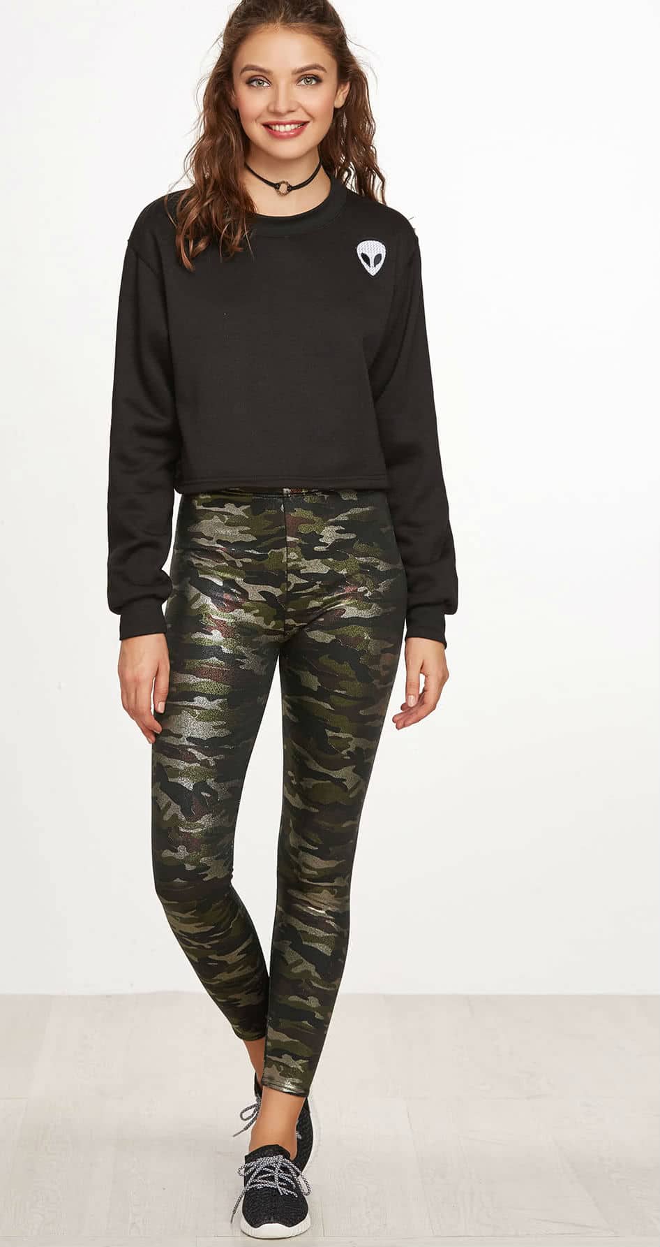 Light or more closed T-shirts in light colors also go well with camouflage leggings. The most interesting thing is that you decide when your image will be more romantic and when sporty. You just need to change sneakers to heels or vice versa. At the same time, the image itself will change, because under the camouflage leggings, both types of shoes fit equally well.