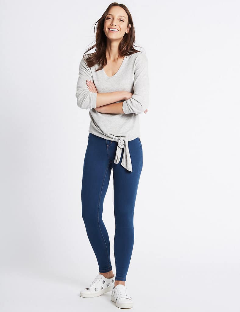 Blue Leggings Named Differently juggins, appeared on the market relatively recently. Such models very successfully imitate jeanswithout being such. They are made of thin denim with the addition of elastic types of fabrics, which allows them to perfectly grab your legs.