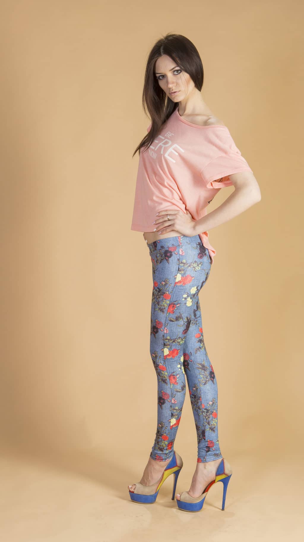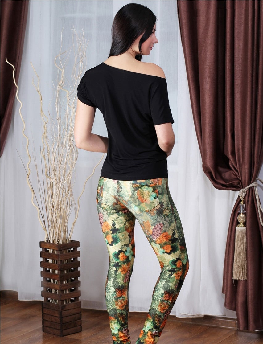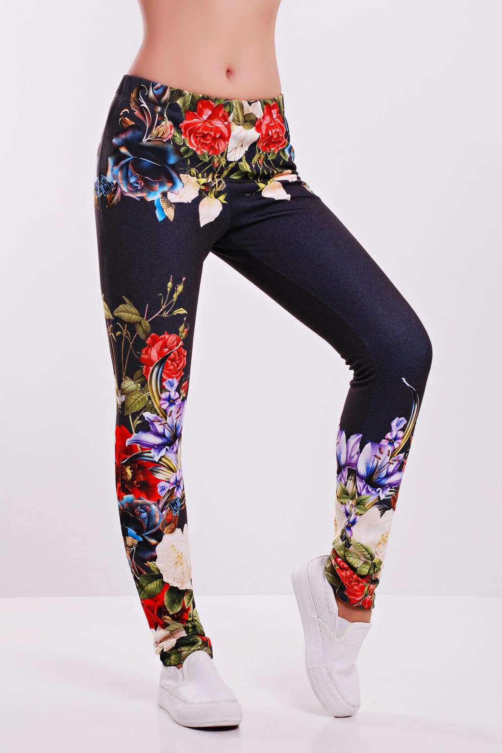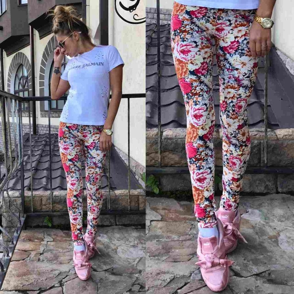 One of the most beautiful types of leggings are leggings with flowers. These leggings have a bright, or black and white color,but due to the flower print, tend to visually enlarge body parts. Therefore, always remember this when choosing this model.