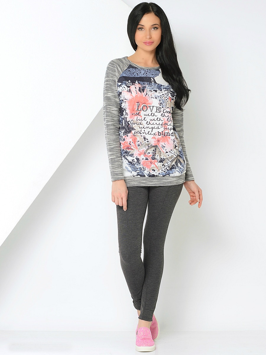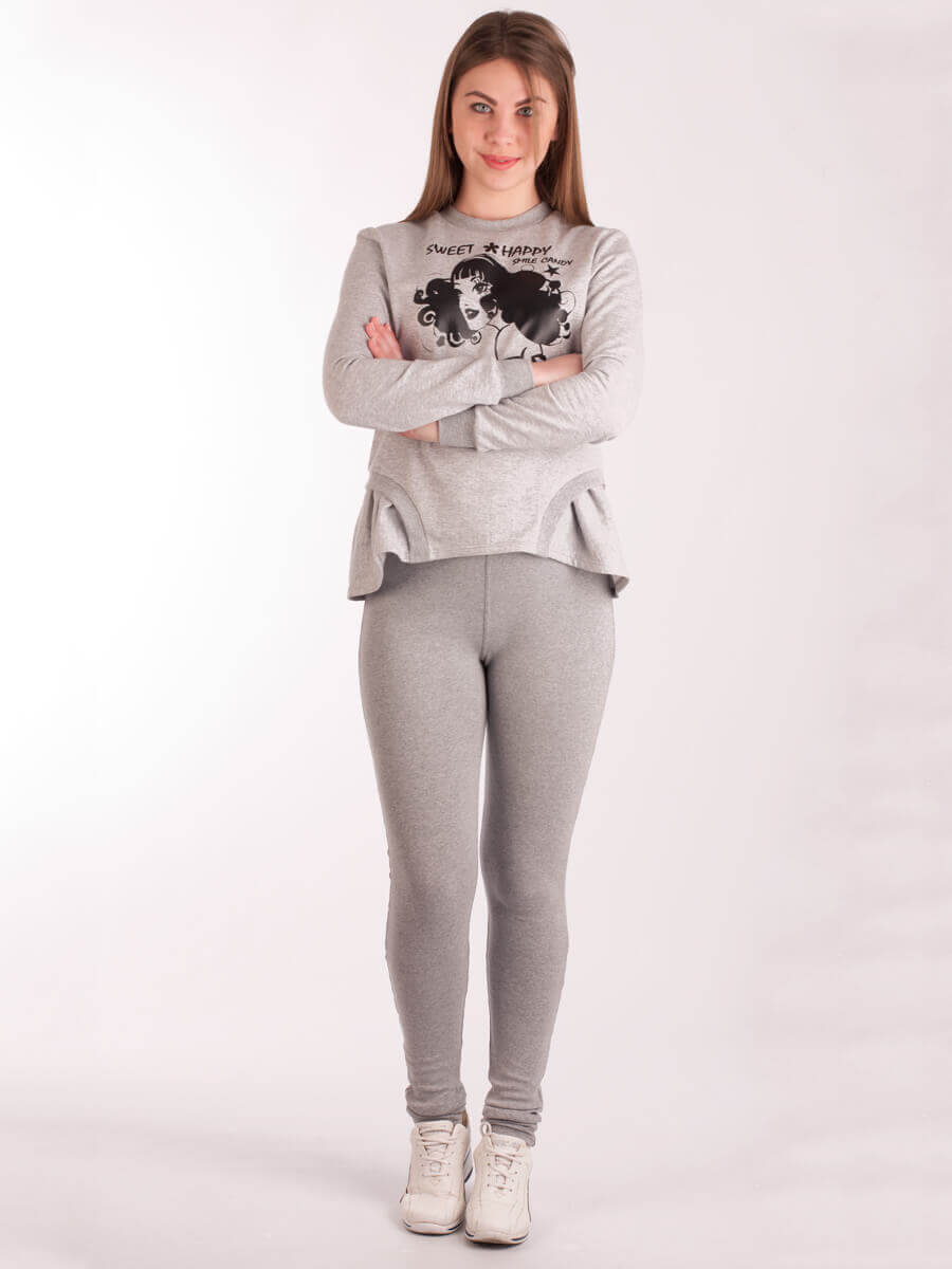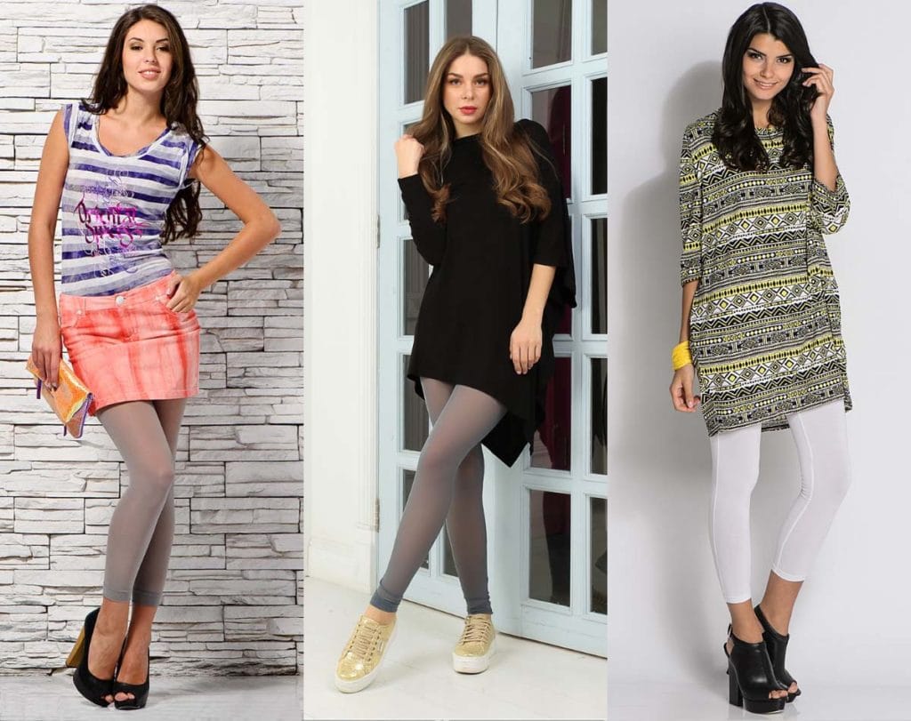 There are different models of gray leggings. Some have a similar look with nylon tights. Most often they are worn under warm knitted dresses or sweater dresses in black. In summer, you can choose a light, long blouse, as well as sandals high heels.