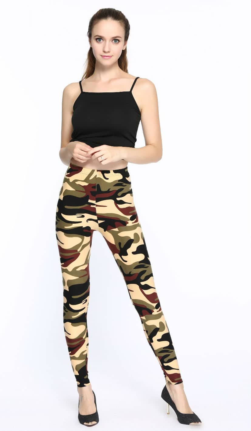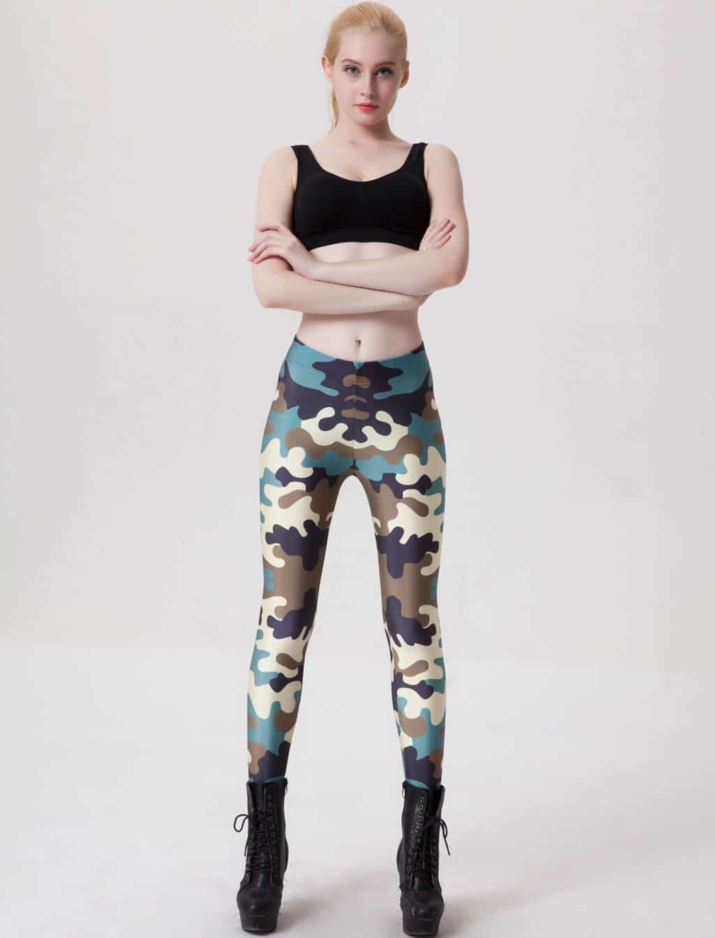 For courageous and strong-willed girls who feel the strength and confidence in themselves, camouflage leggings will be an excellent choice. Such leggings are perfect for both walking around the city and for a trip to nature outside the city.