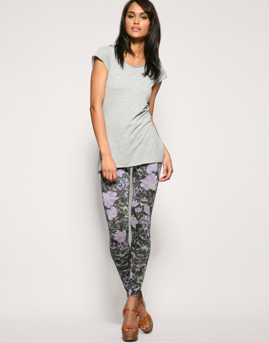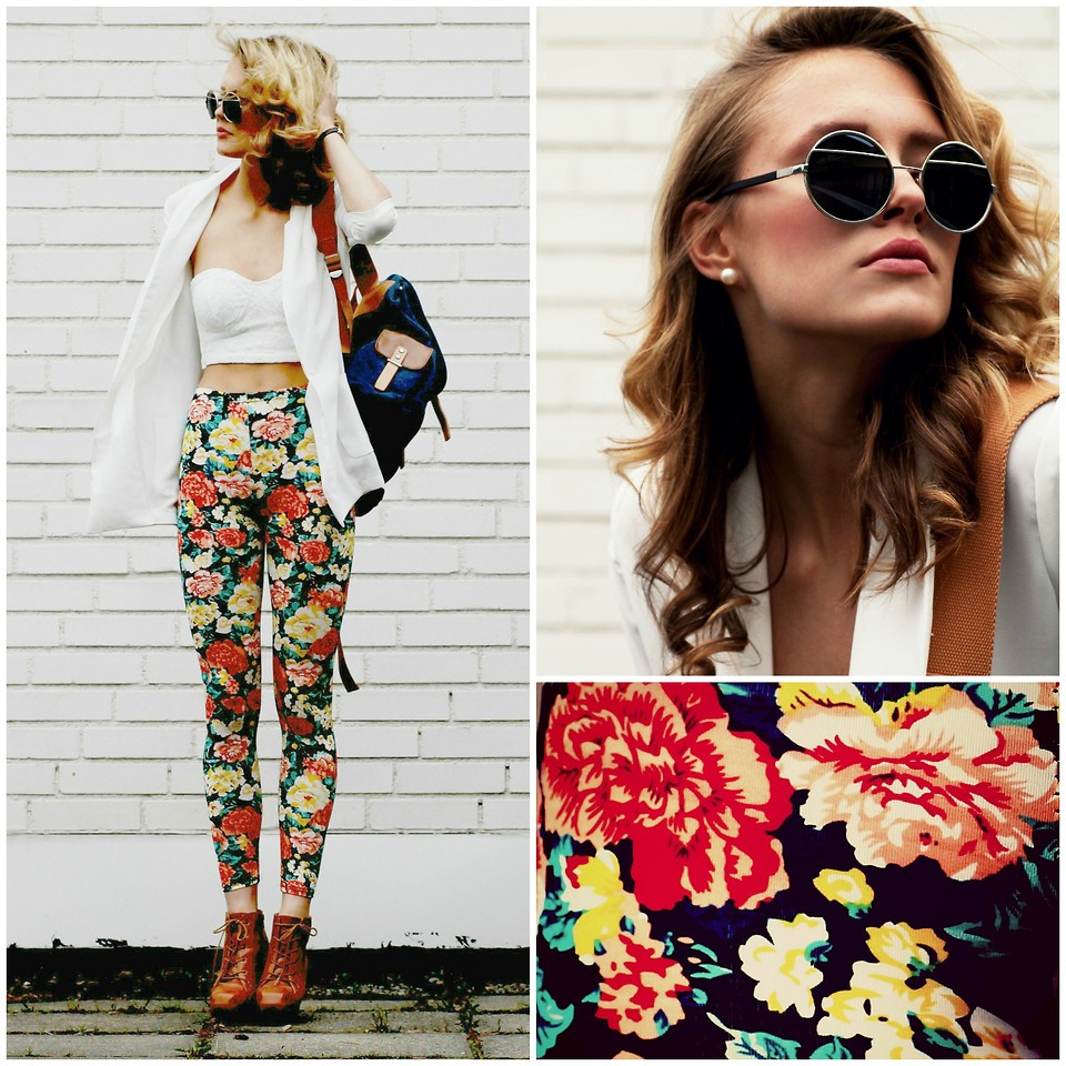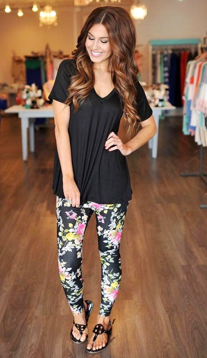 Floral leggings blend perfectly with white. White top will not draw attention to itself, which is good to highlight your bright leggings.