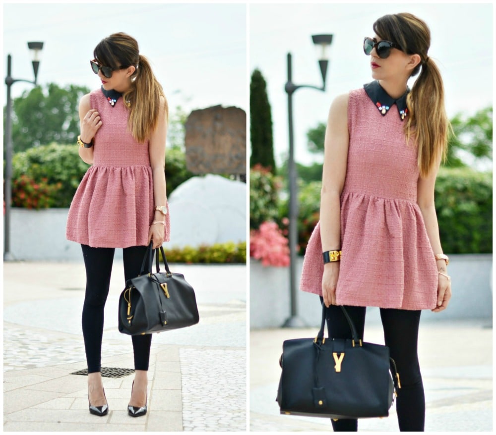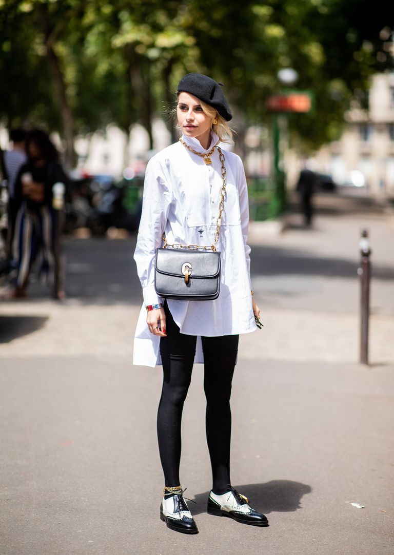 The white color of leggings goes well with the gray color of your top. It can be T-shirts, T-shirts, as well as other summer or warmer things. To create a contrast of colors, choose a bright dress in red or pink color and shoes in the color of the dress itself.