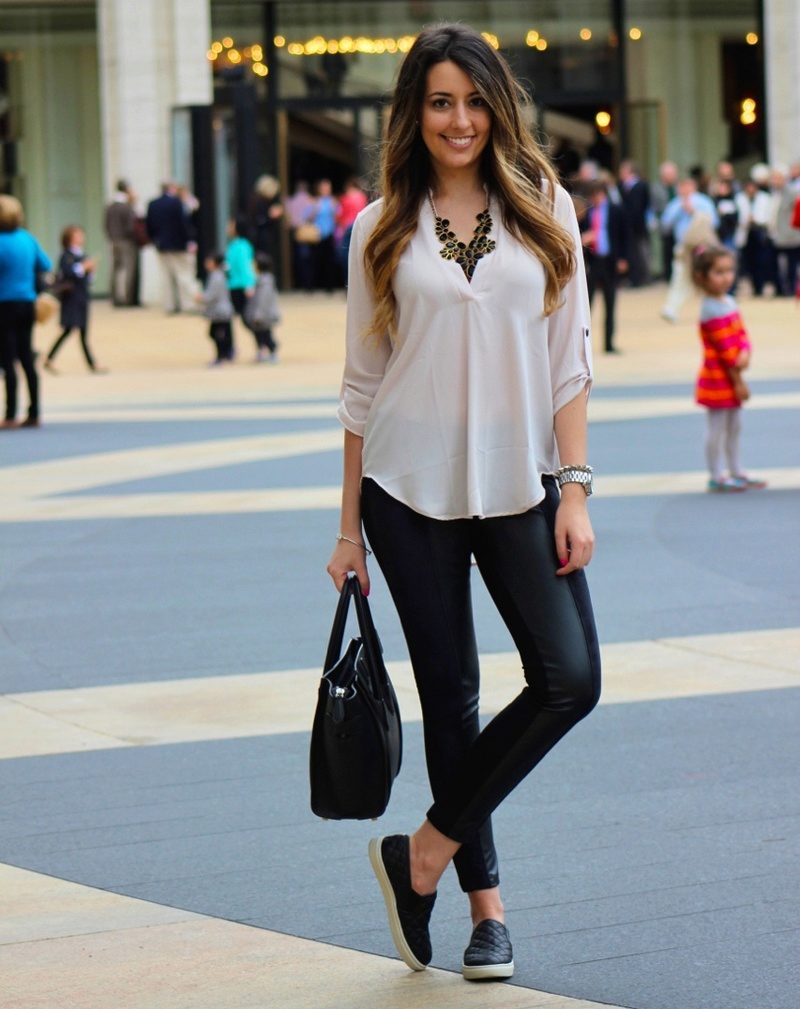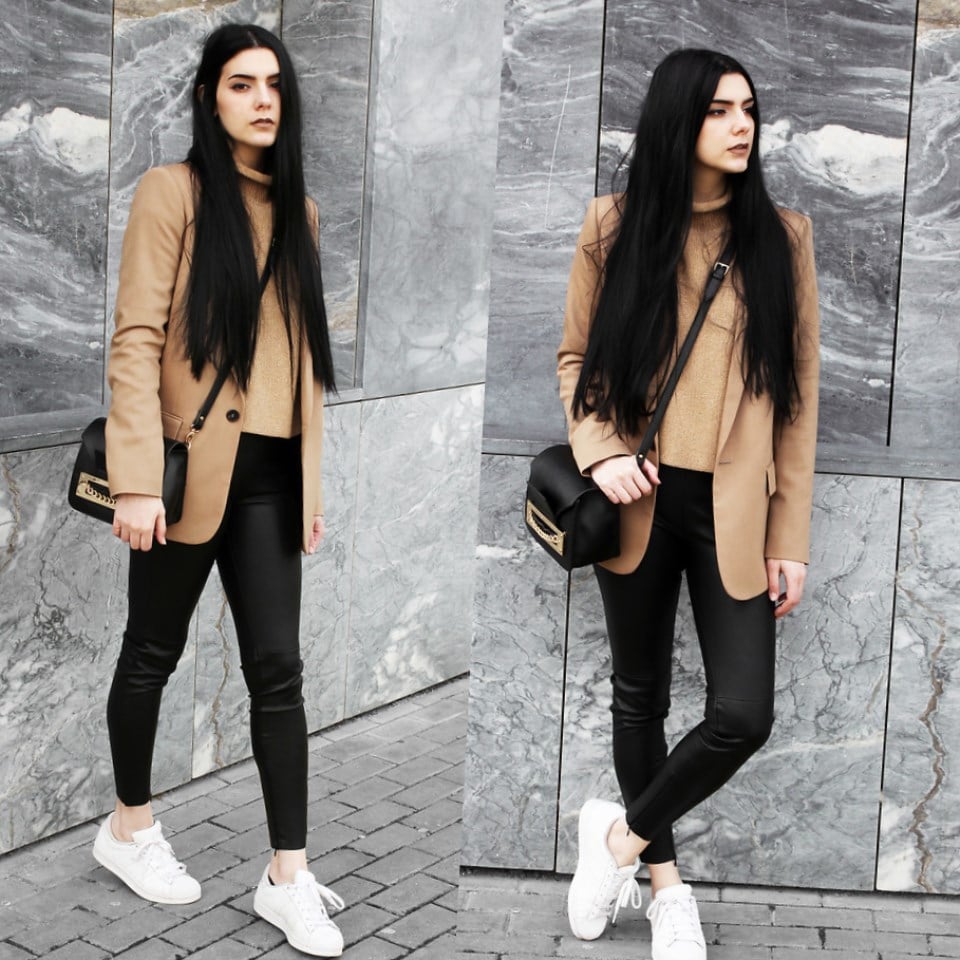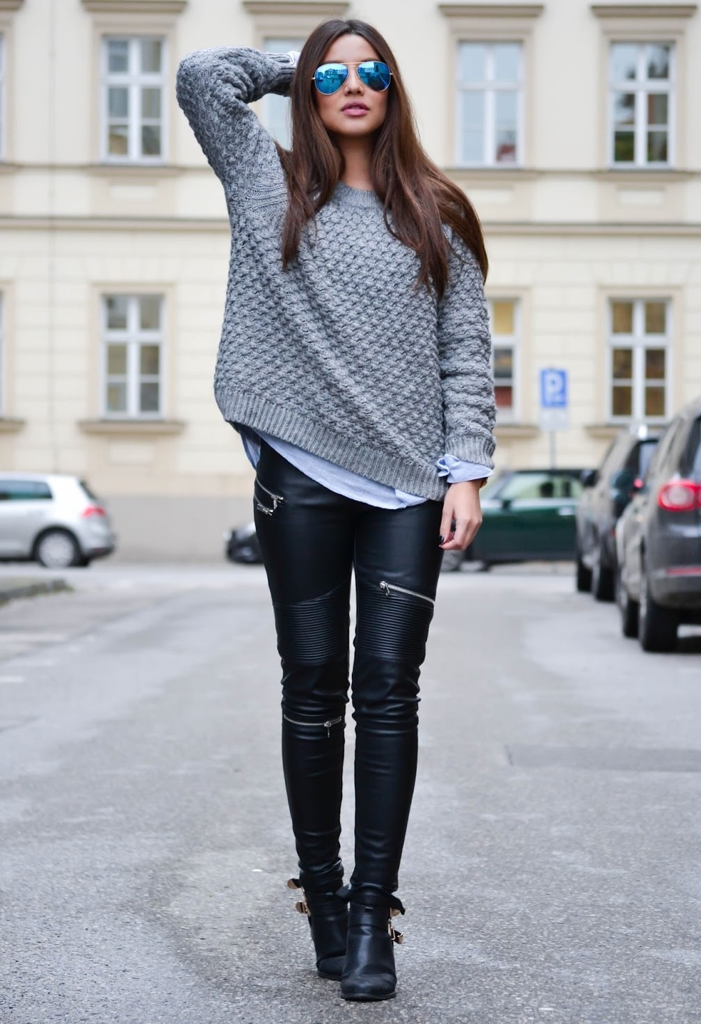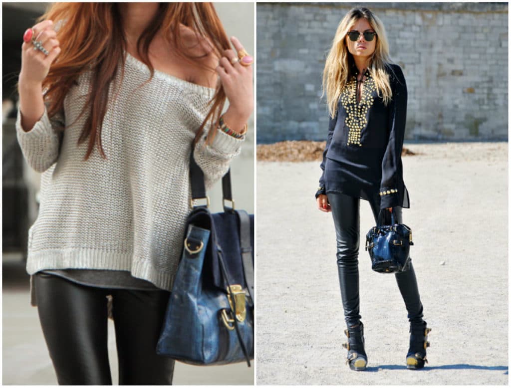 Leather leggings are suitable for knitted dresses of fitted options, oversized sweaters and tunics in ethnic colors. Black boots chelsea ankle boots and sneakers wedges perfectly complement the fashionable and versatile bow.
