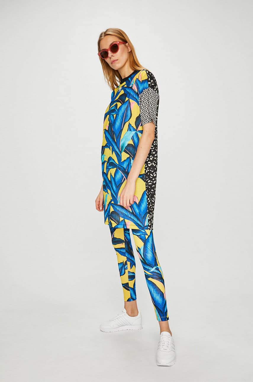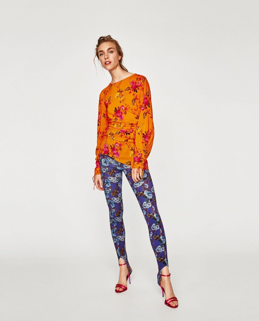 Stylists recommend floral leggings to be worn with a catchy top. It can be monophonic summer t-shirts on one shoulder or pale pink in sports style.