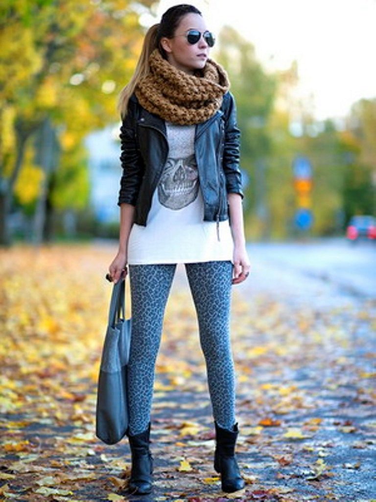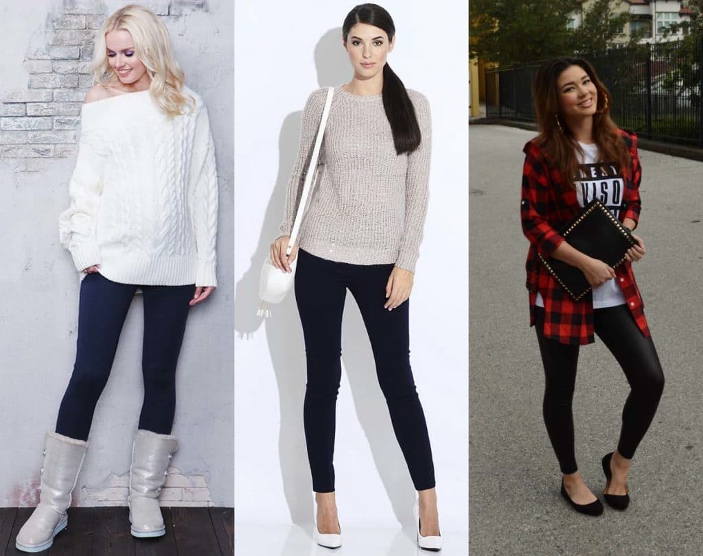 Such leggings go well with a warm top. This can be a large knit sweater, sweater dress, leather jackets, coats, as well as a poncho.