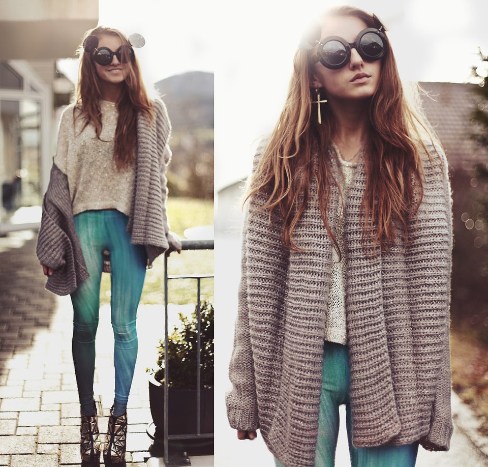 Oversized sweaters are the perfect fall choice for any leggings color scheme.As shoes, you can choose boots, high boots, ankle boots, boots. And if the street is still warm enough, then you can wear shoes or ballet shoes.