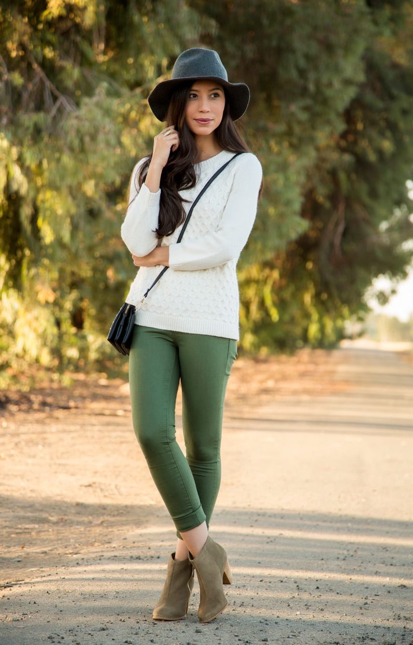 You can also use cardigan in dark color. It fits perfectly with a white T-shirt and olive-colored leggings. A cap will help to complement the image. slip-ons in tone cardigan.