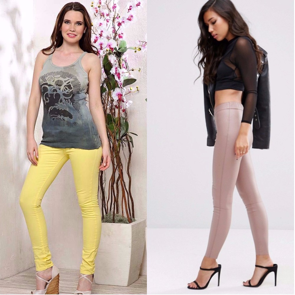 A good option to dilute weekdays with color paints is to turn your attention to yellow, pink leggings and other color models. They combine perfectly with a light color in a discreet print top, as well as with more restrained things. And if it gets cool by evening, then you can always complement your look with a sweater or knitted sweater.