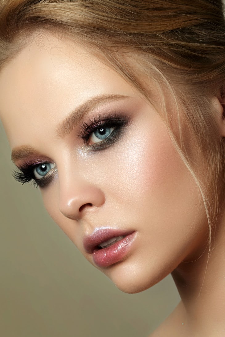 Remember that under this type of eye makeup, lipstick is not necessarily chosen in bright colors. And the skin of the face itself is tinted with a small amount of foundation or powder.