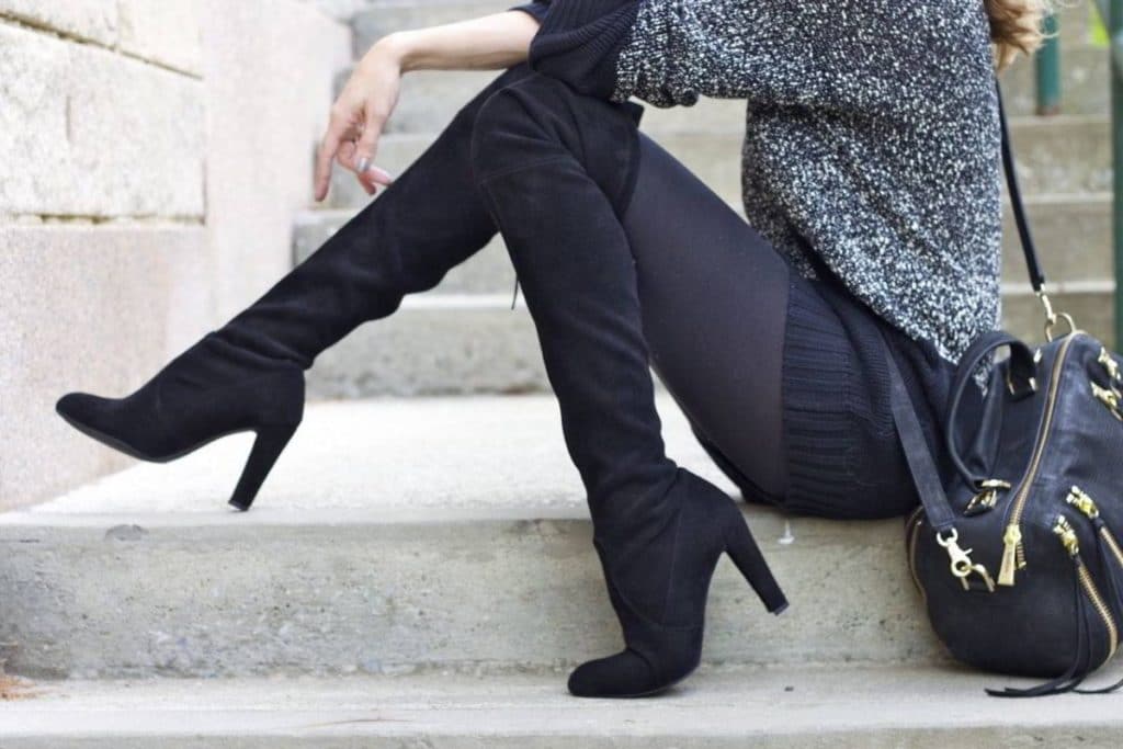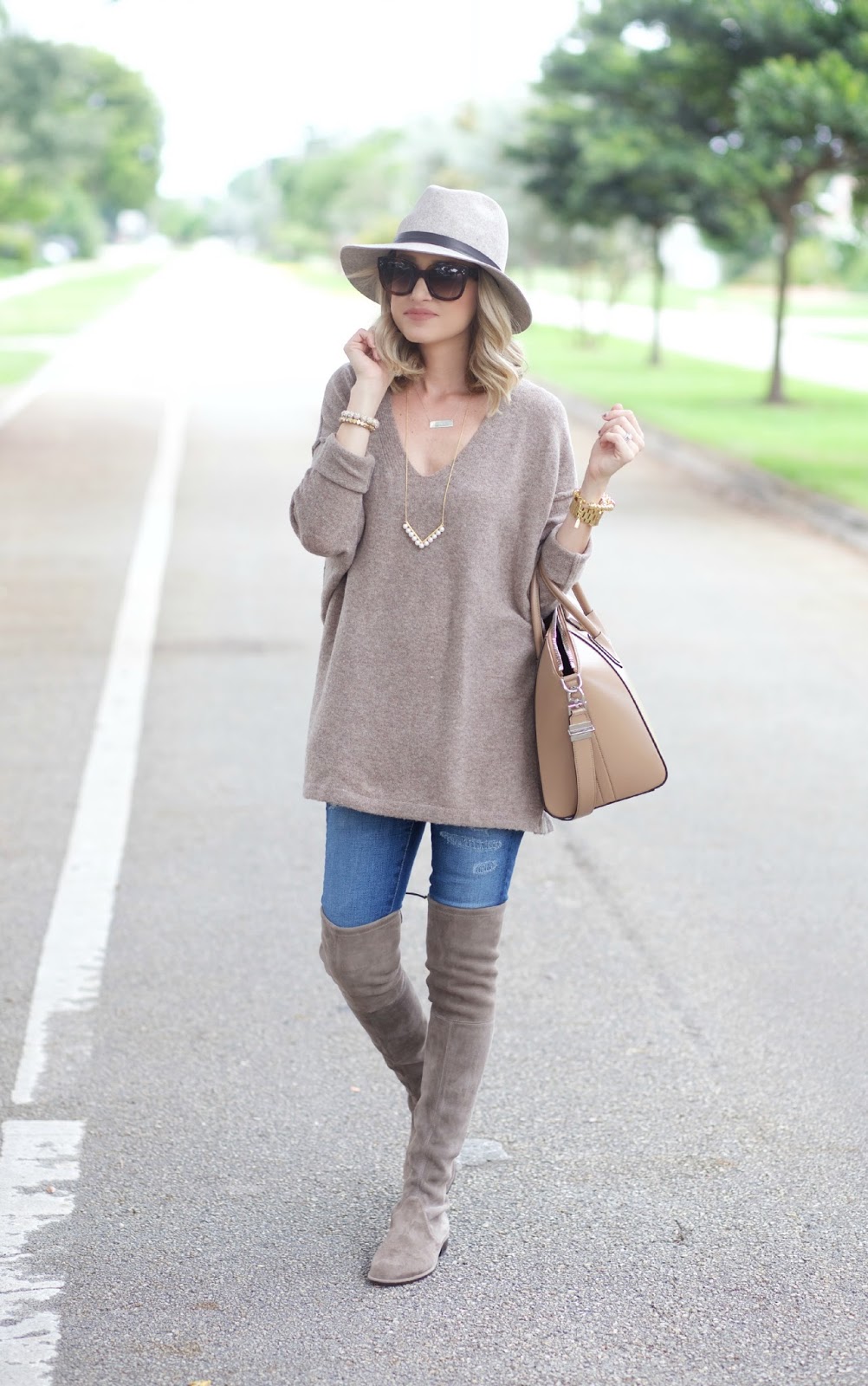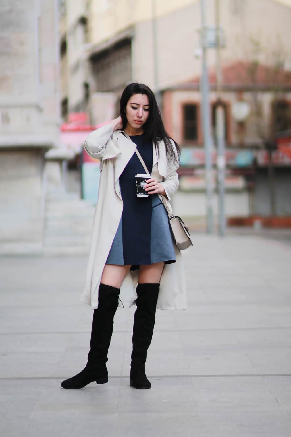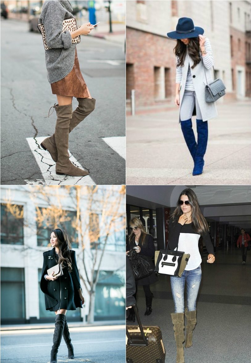 Opt for a dress-suit and beige suede over the knee boots for a stylish, stylish look. A red, black or other colored handbag will help to dilute the image.