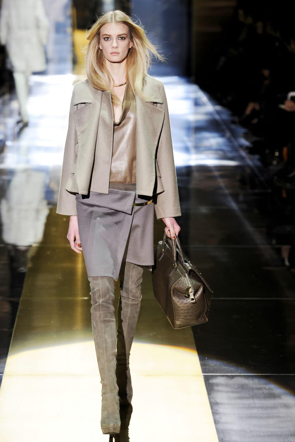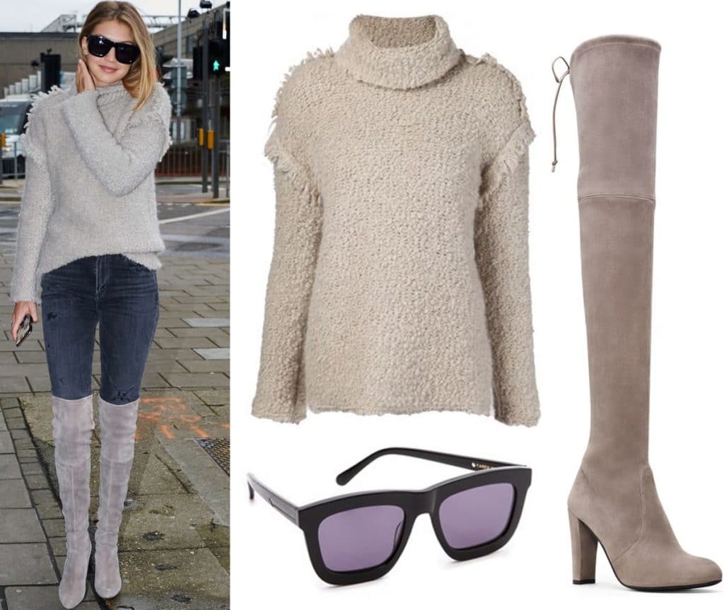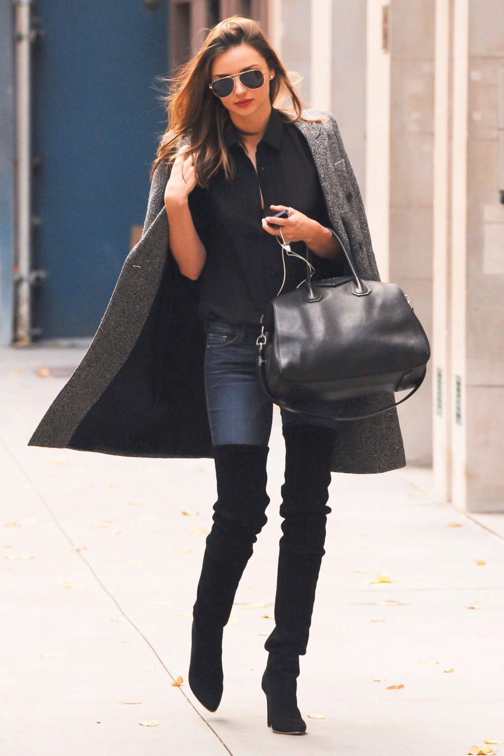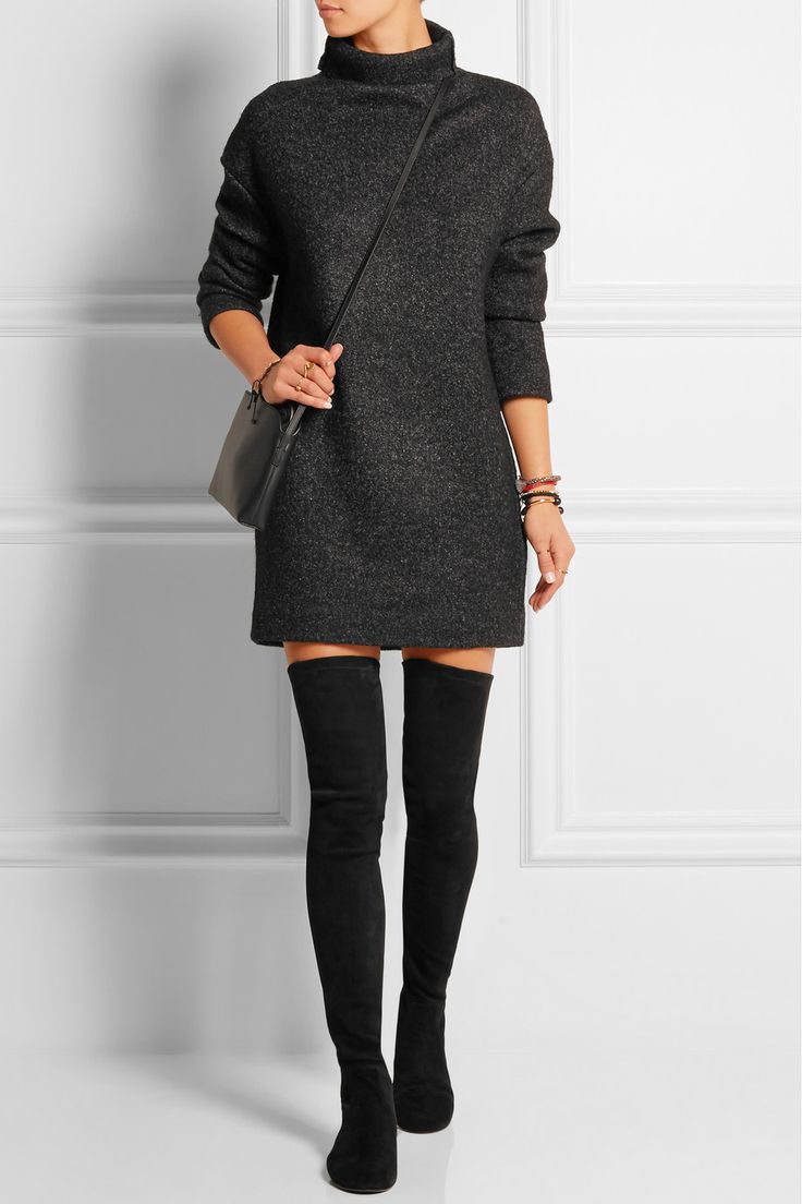 Opt for a dress-suit and beige suede over the knee boots for a stylish, stylish look. A red, black or other colored handbag will help to dilute the image.