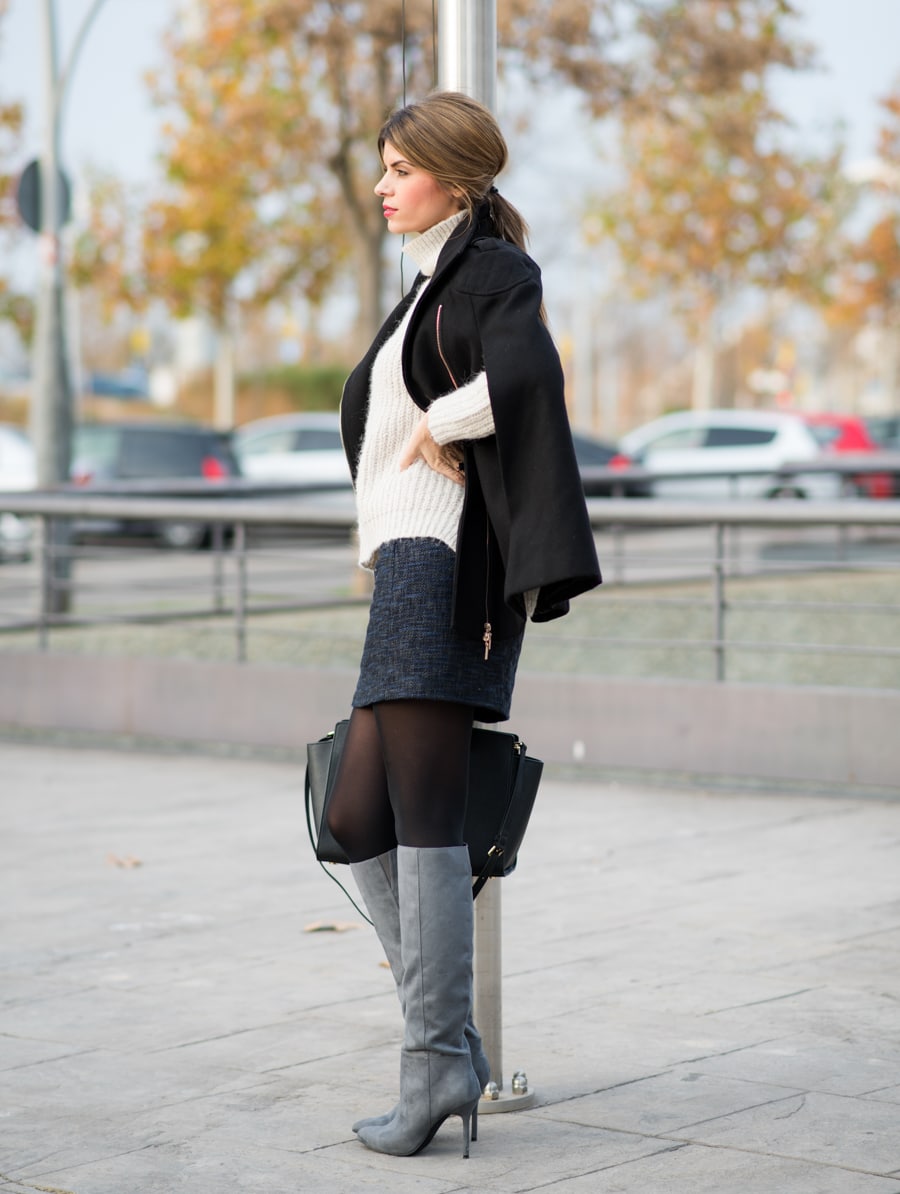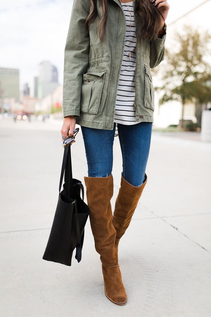 Cream suede boots go well with black skinny gins with a short jacket.If it’s cold outside, add a wide scarf to the image, it will not be superfluous. If the weather pleases with warmth, then a small hat will be a great addition to the spring look.