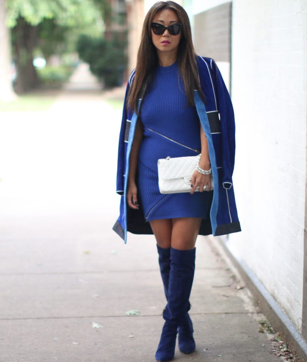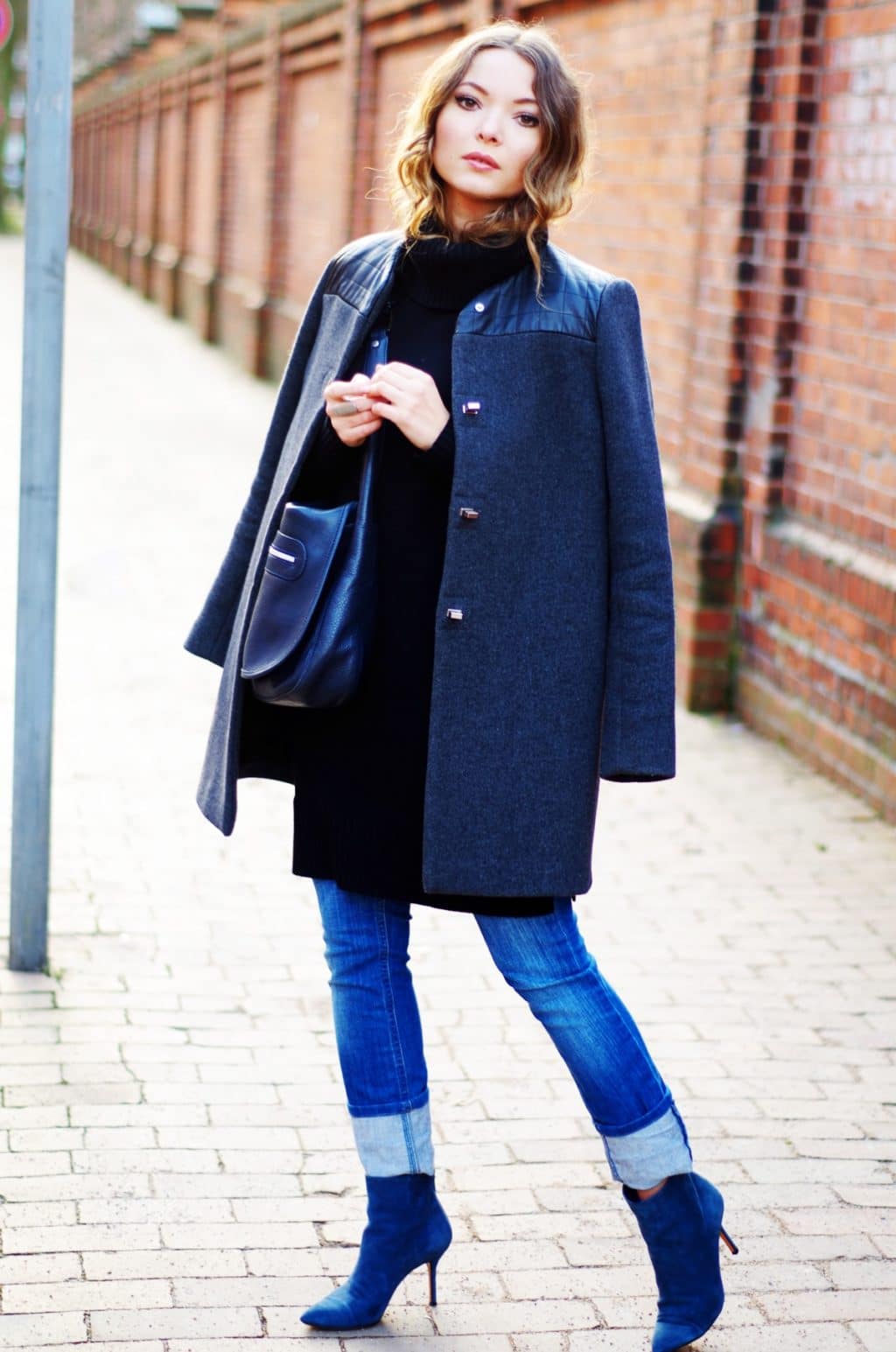 Blue suede is quite an interesting choice, but it’s not suitable for all kinds of things. To make the image as successful as possible with such a model, you need to choose your top to match the boots themselves.