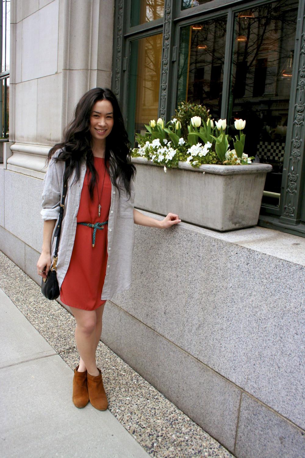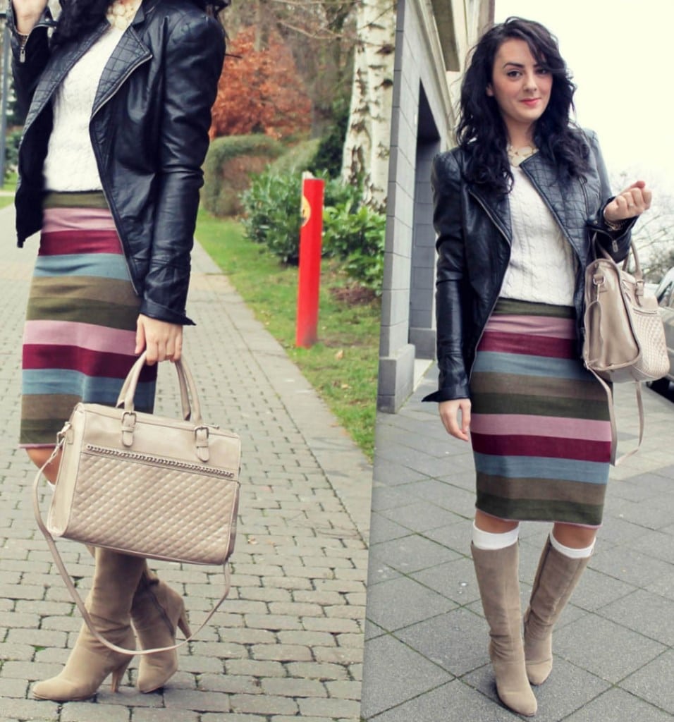For a spring, a skirt, a sweater and a black jacket, with not high beige boots, will be a good choice.