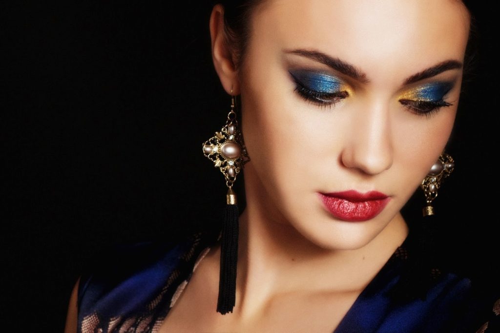Also under the blue dress, you can choose the rich blue color of the shadows, with the addition of yellow in the inner corner of the eye. These colors are perfect for black hair and your makeup will be very successful and original.