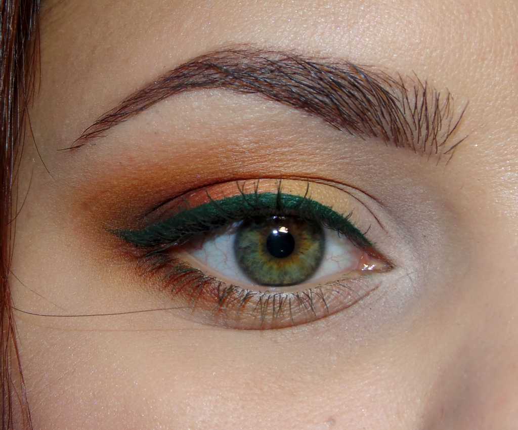 A bright look make-up includes a smoky look in dark colors. Be sure to apply it with the help of long sharp arrows, as well as generously tint eyelashes. To brown eyes, you can choose a green eyeliner. It is in perfect harmony with brown eye color.