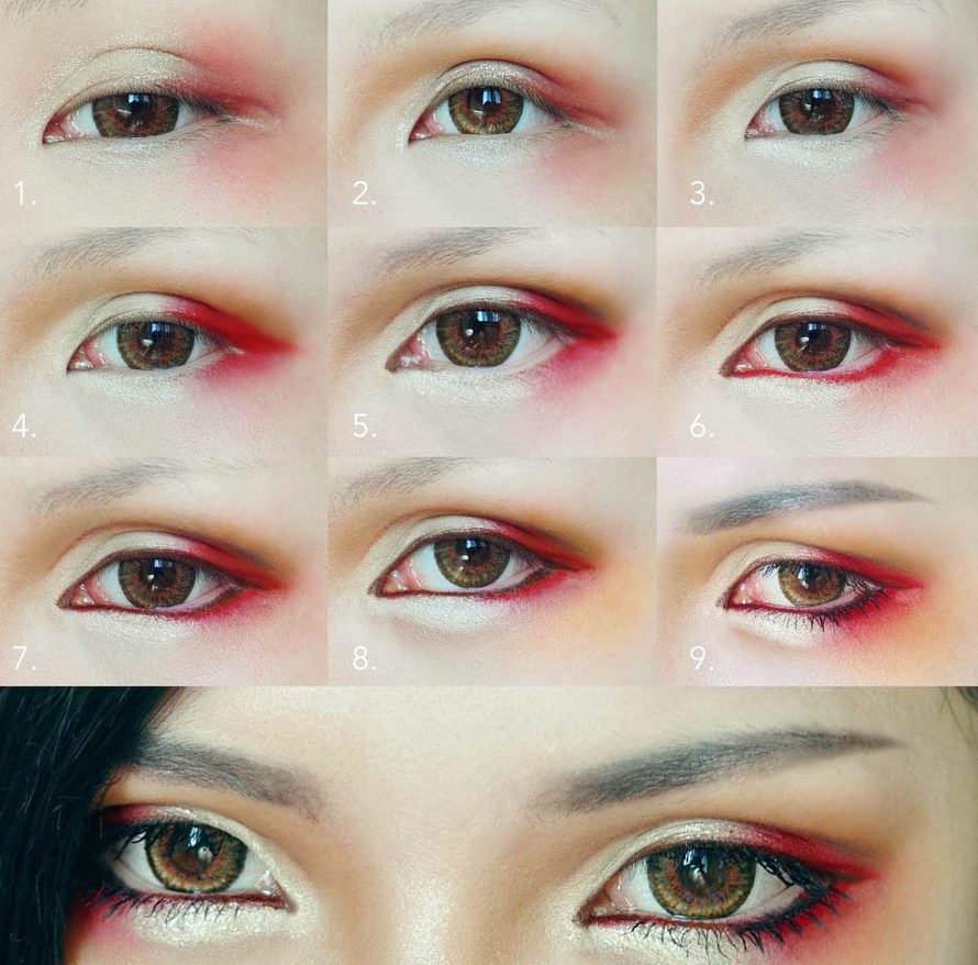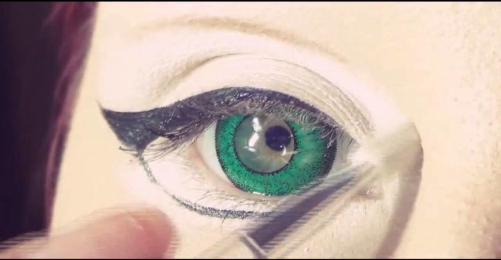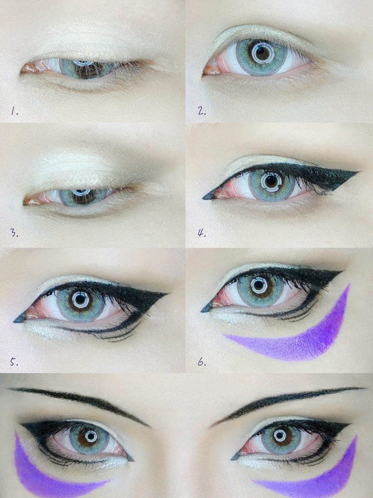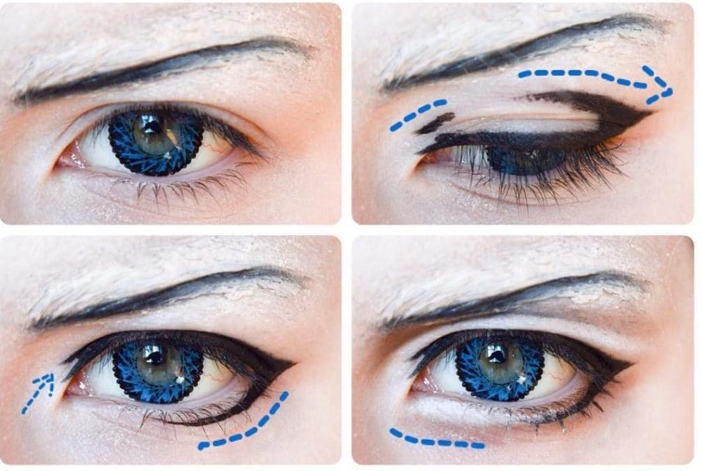To begin with, you should draw a line on the upper eyelid with a black pencil or eyeliner, with the transition to a sharp ponytail in the outer corner of the eye. But the lower arrow should be drawn lower than the lower eyelid, thereby you can create the effect of more round eyes. Also, with a pencil it’s worth painting on rare, small cilia. And then move on to the shadows. Shadows in anime are always bright, colorful. Choose the color of the shadows depending on the color of your lenses.