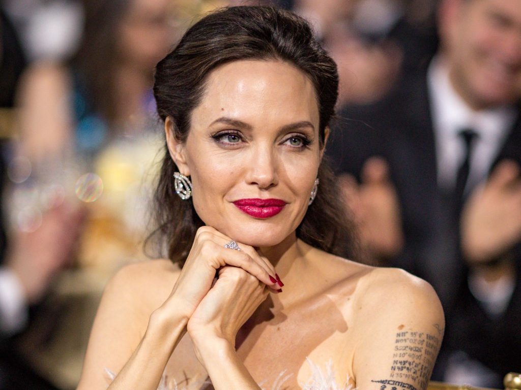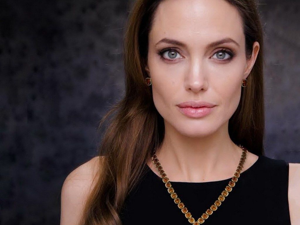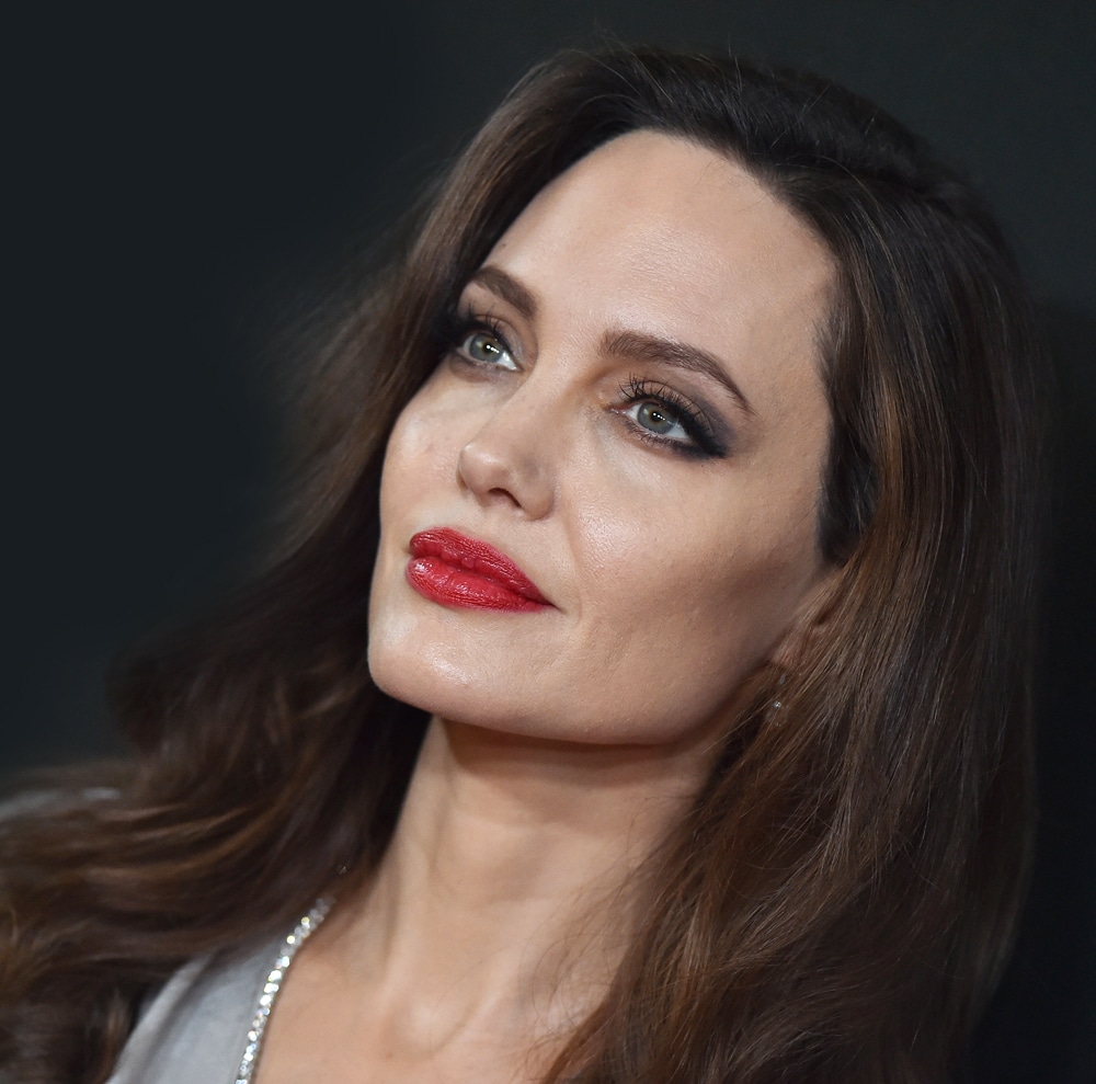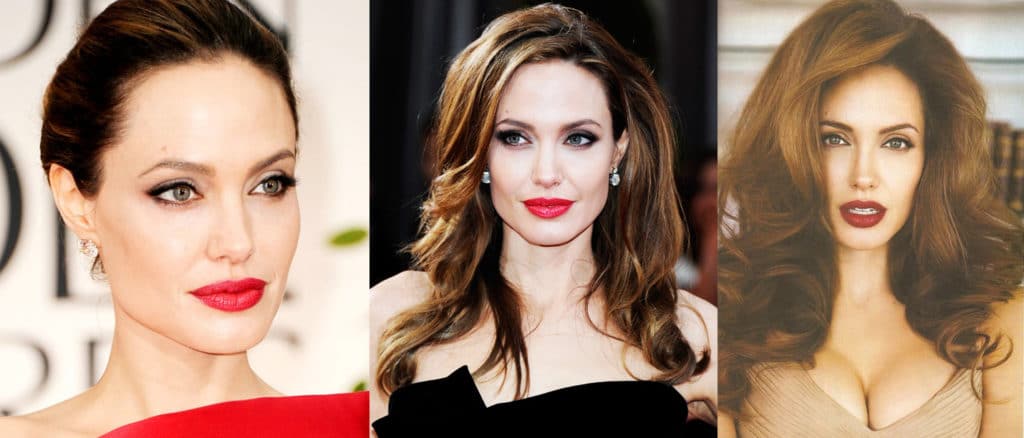 The choice of lipstick in Angelina’s delicate makeup is limited to pink, peach or pearl shades.