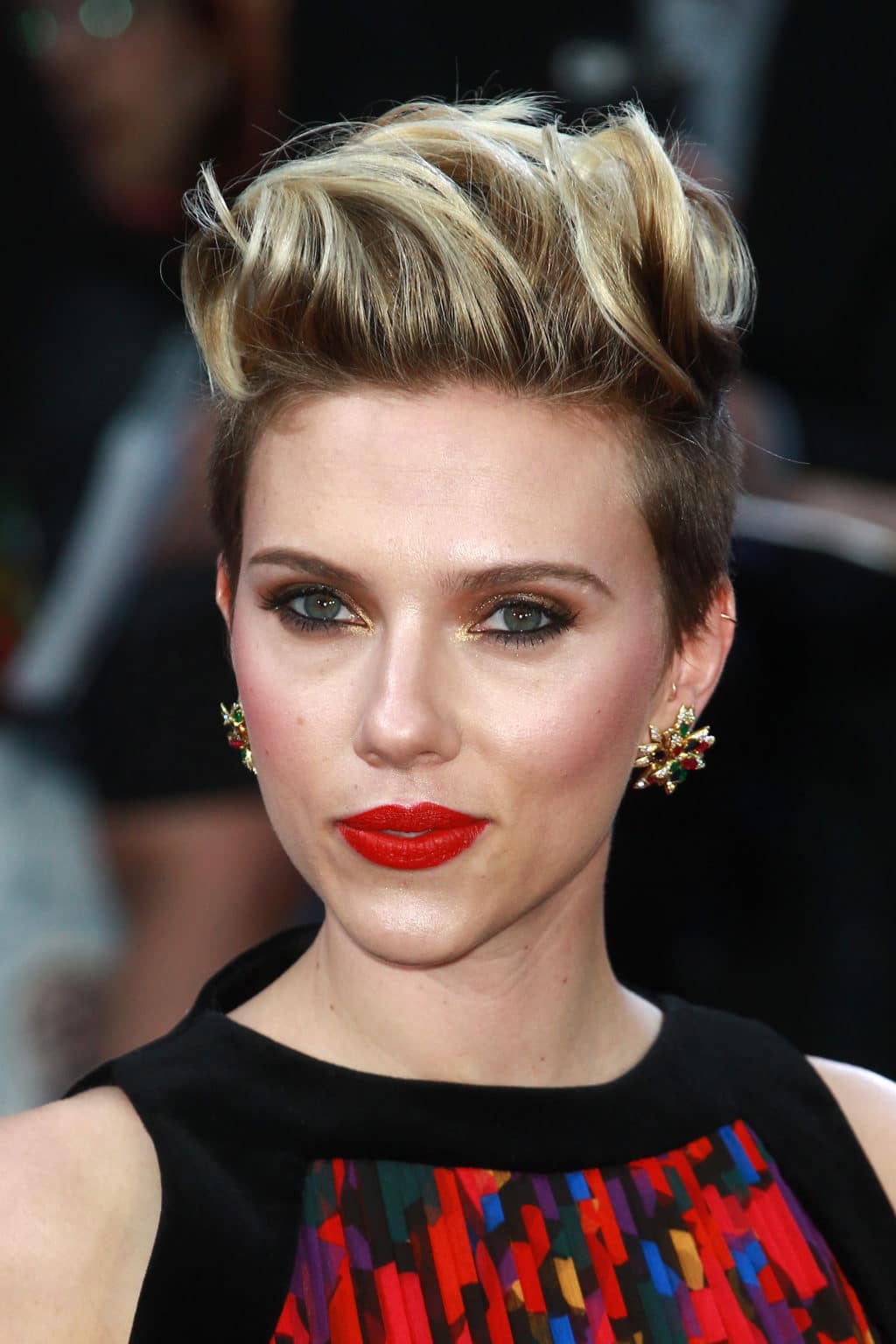 In a more subtle version, Scarlett prefers classic arrows, bright lipstick in red shades, as well as dark shadows. But she doesn’t always tint her eyes in such a bright tone, mostly highlighting only the lips.