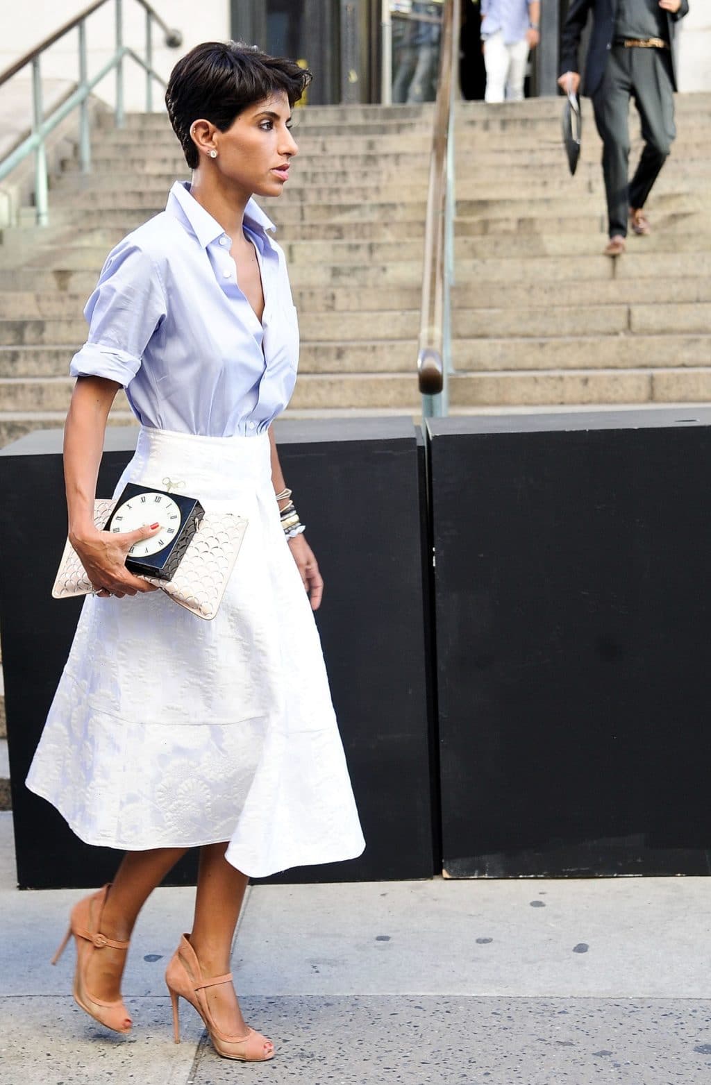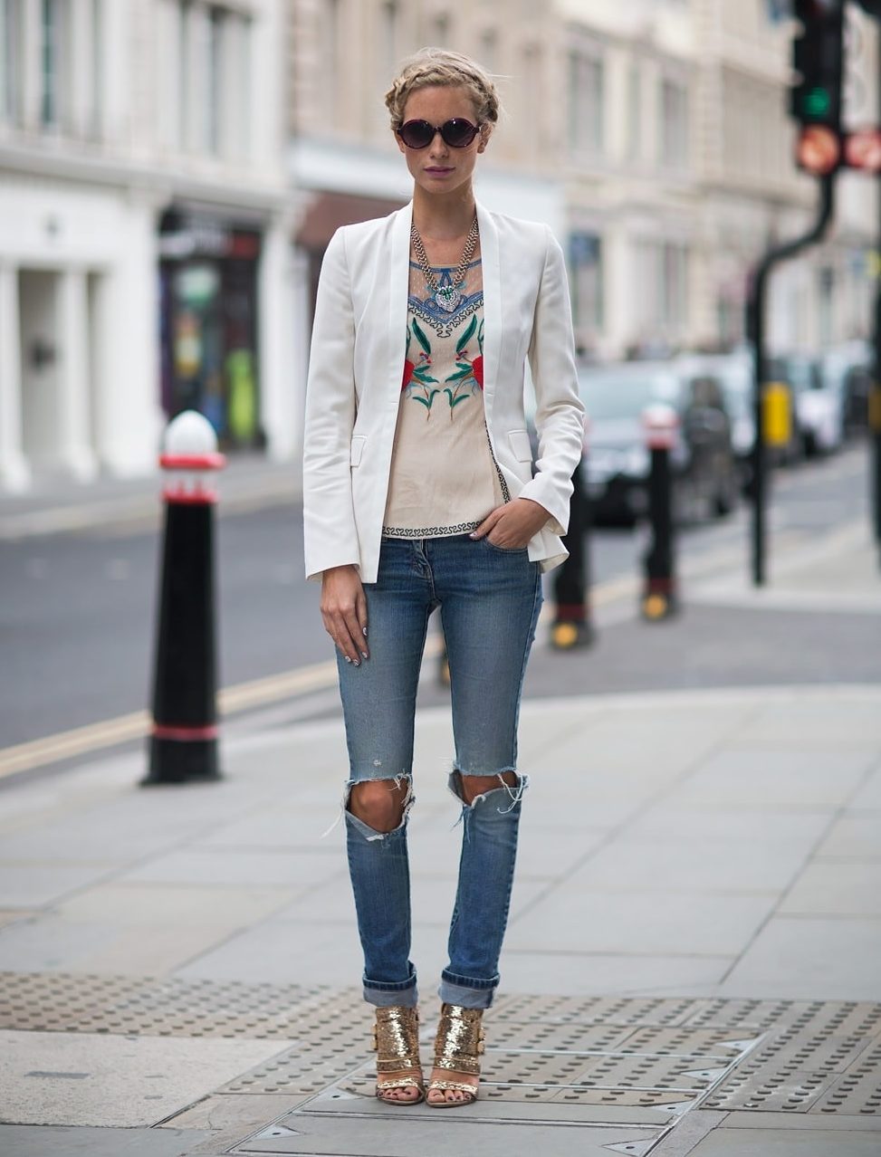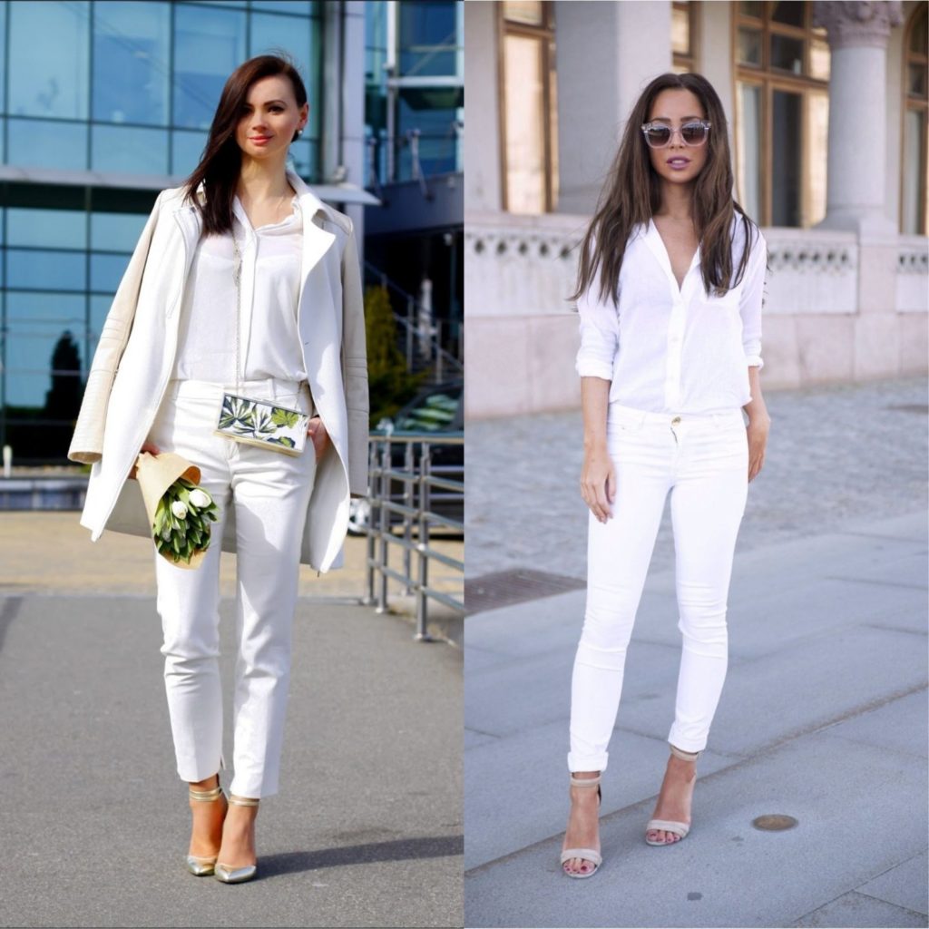 It can be trousers, a dress, and white jeans. As the top, you can use bright blouses to create a contrast of colors. Or white, gray, to create a monochrome image.