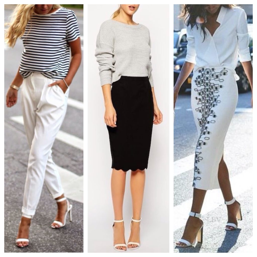 Older girls are advised to turn their attention to white sandals of more elegant models. These sandals are simply indispensable in drawing up a business image, which allows you to create the perfect office bow. A white or black pencil skirt, as well as classic light trousers, will suit them well. As a top, turtlenecks in a non-bright print, as well as light sweaters or blouses, will be a great addition to the image.