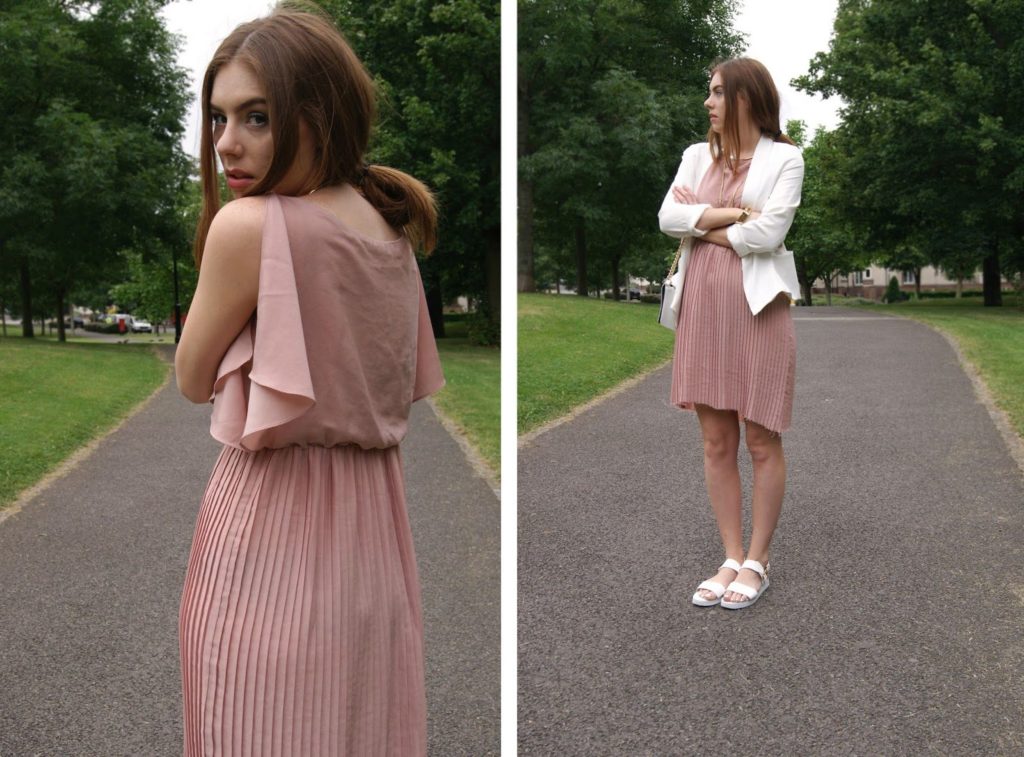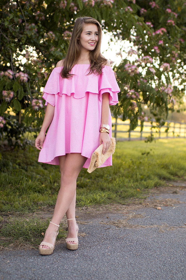 A bright colored dress with the addition of white will be a great choice for elegant white sandals.