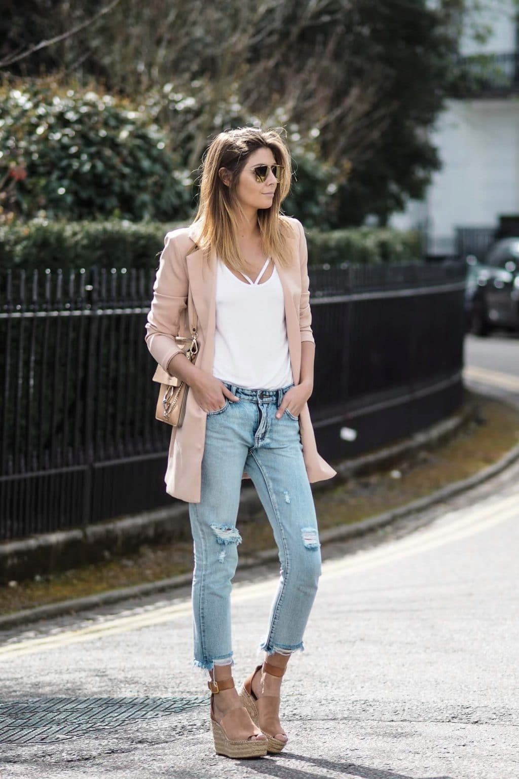 Beige wedge sandals in combination with white trousers or white dresses will help you achieve a beachy, laid-back look.