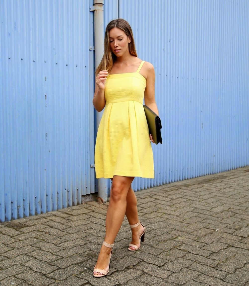 The combination of a blue dress and beige sandals is the perfect option when the colors of your clothes accentuate your skin color.
