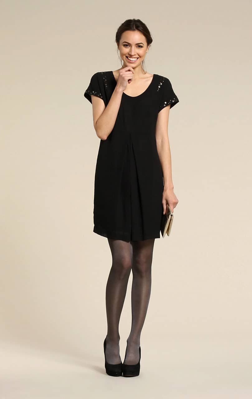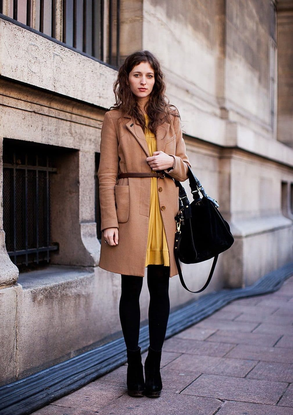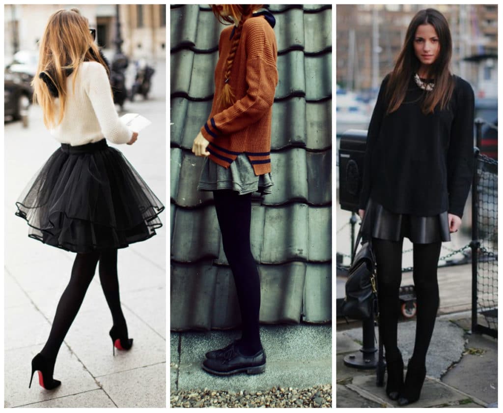 Wear heavy black tights under warm, knitted dresses. But the light 20-40 DEN with light dresses, airy skirts, as well as shorts. The color category of your top can be any. Black color goes well with both colored things, and with white and black.