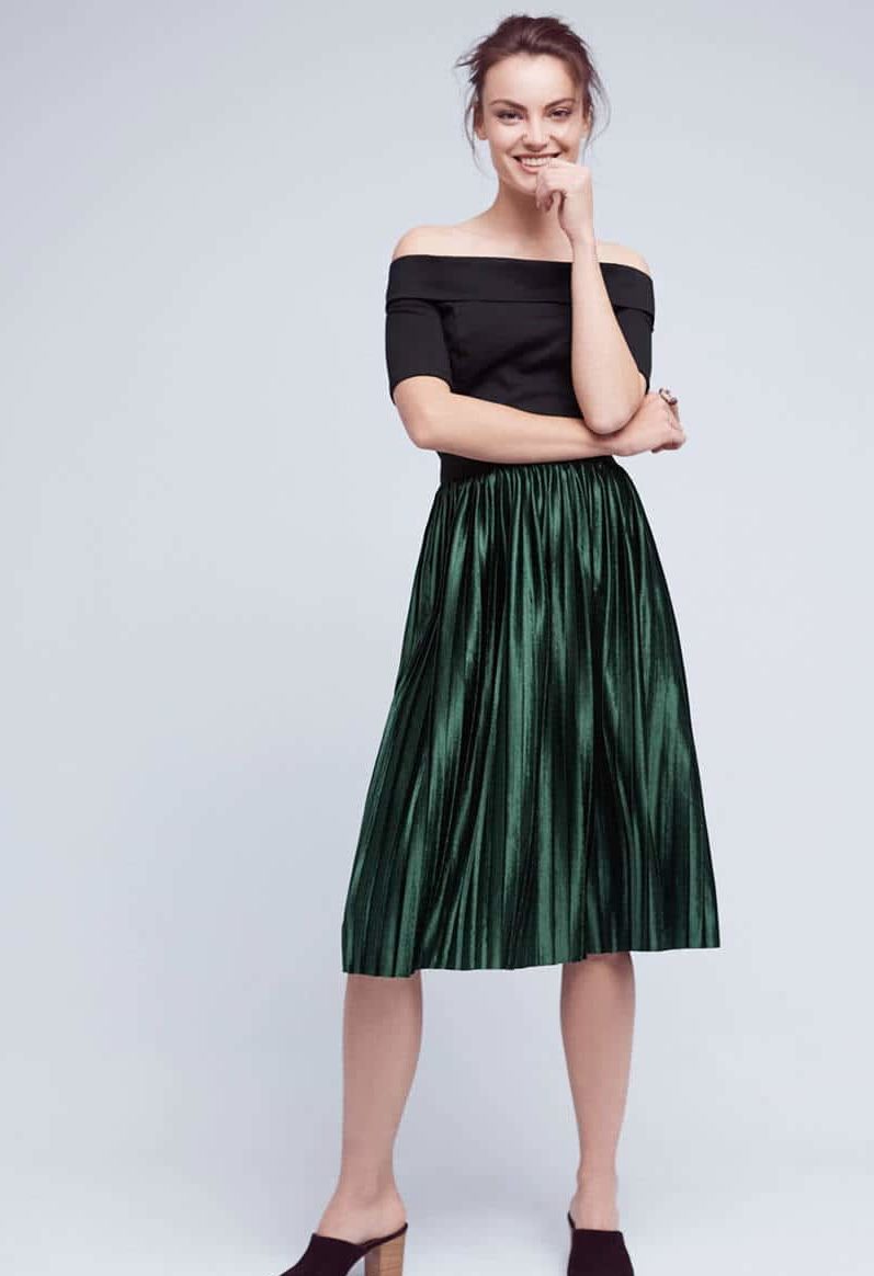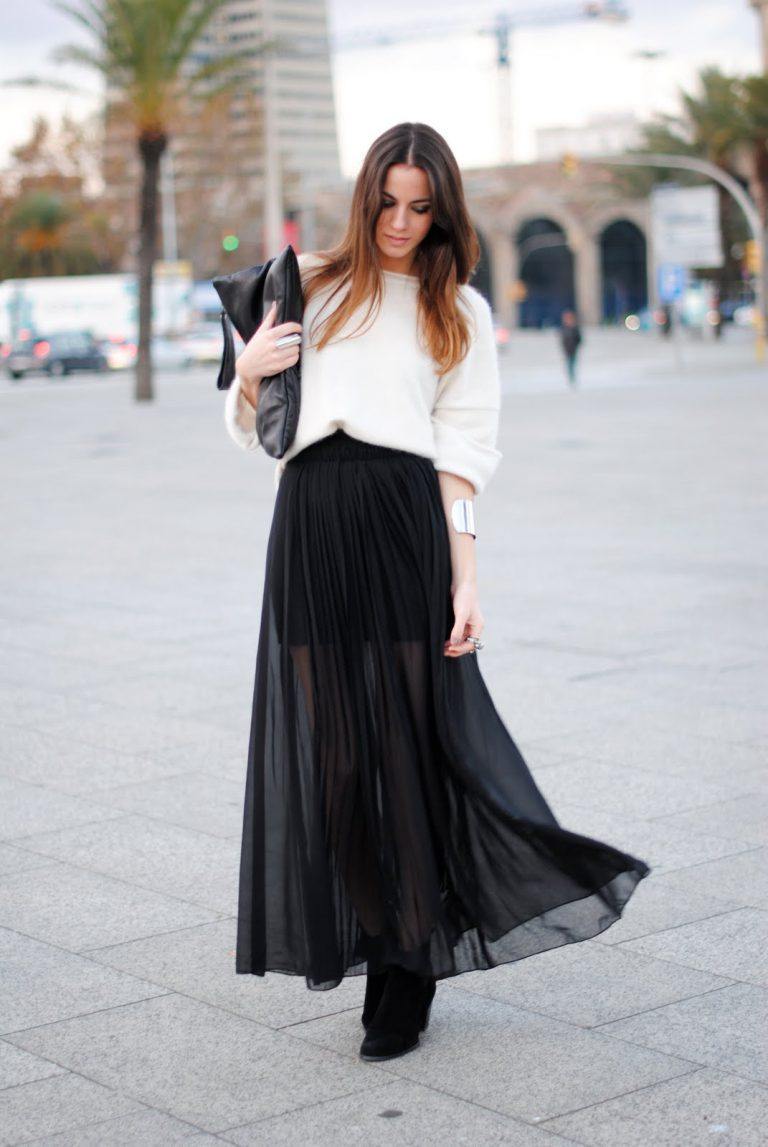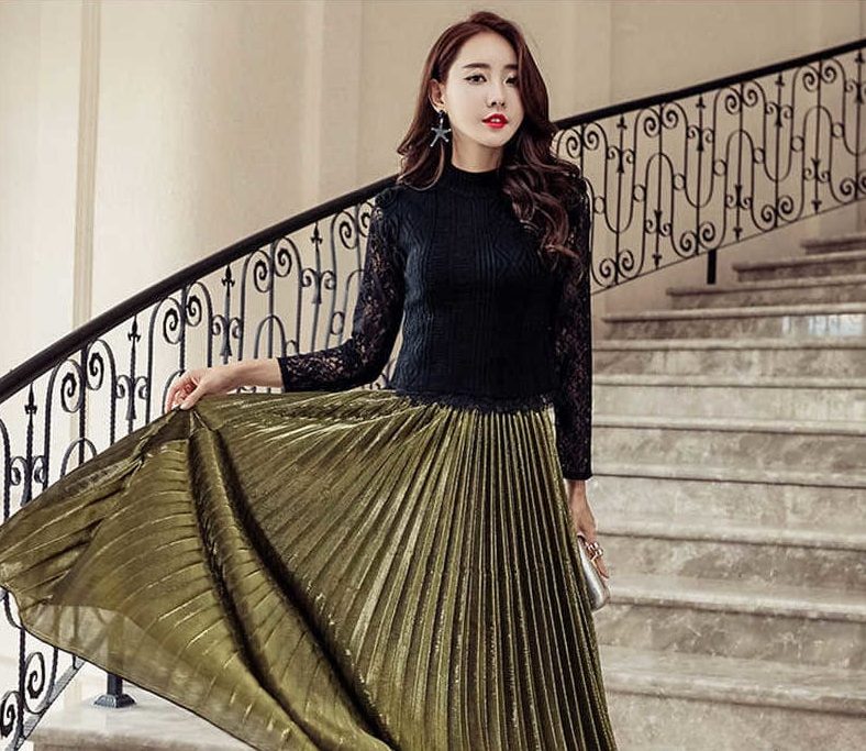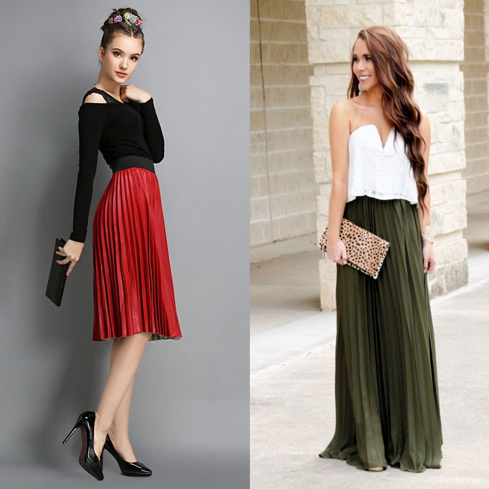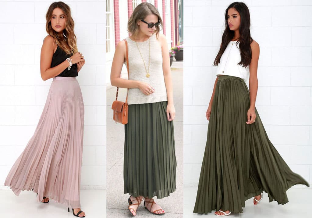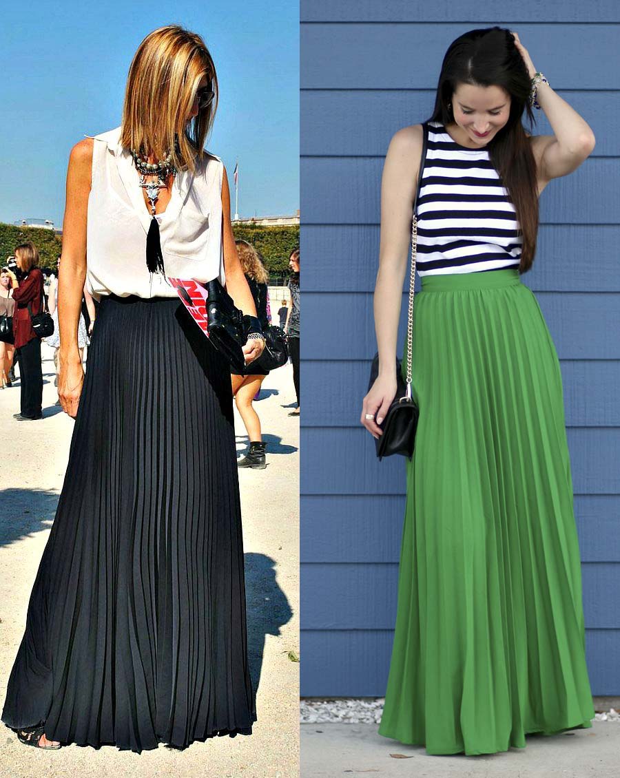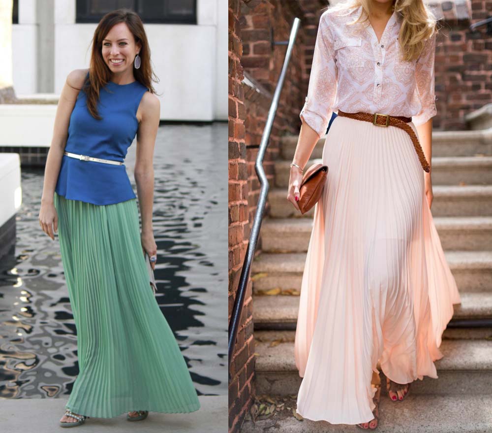 Color pleated midi and maxi skirts can be combined with white lace blouses, classic button down shirts, and floral print blouses. According to the color scheme, choose to green skirts, a white striped top or a blue plain blouse, to blue white, dark, and also a yellow top.