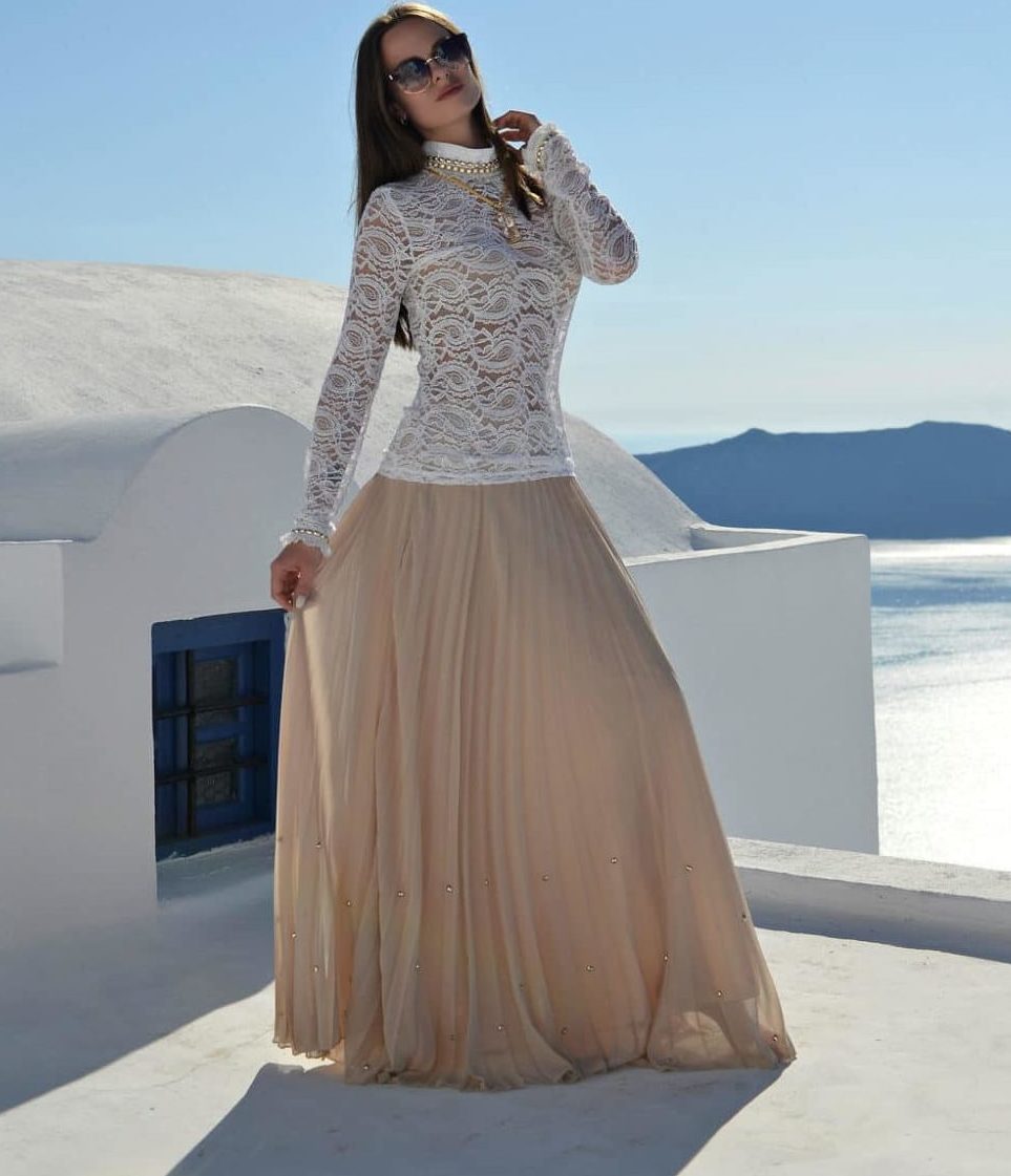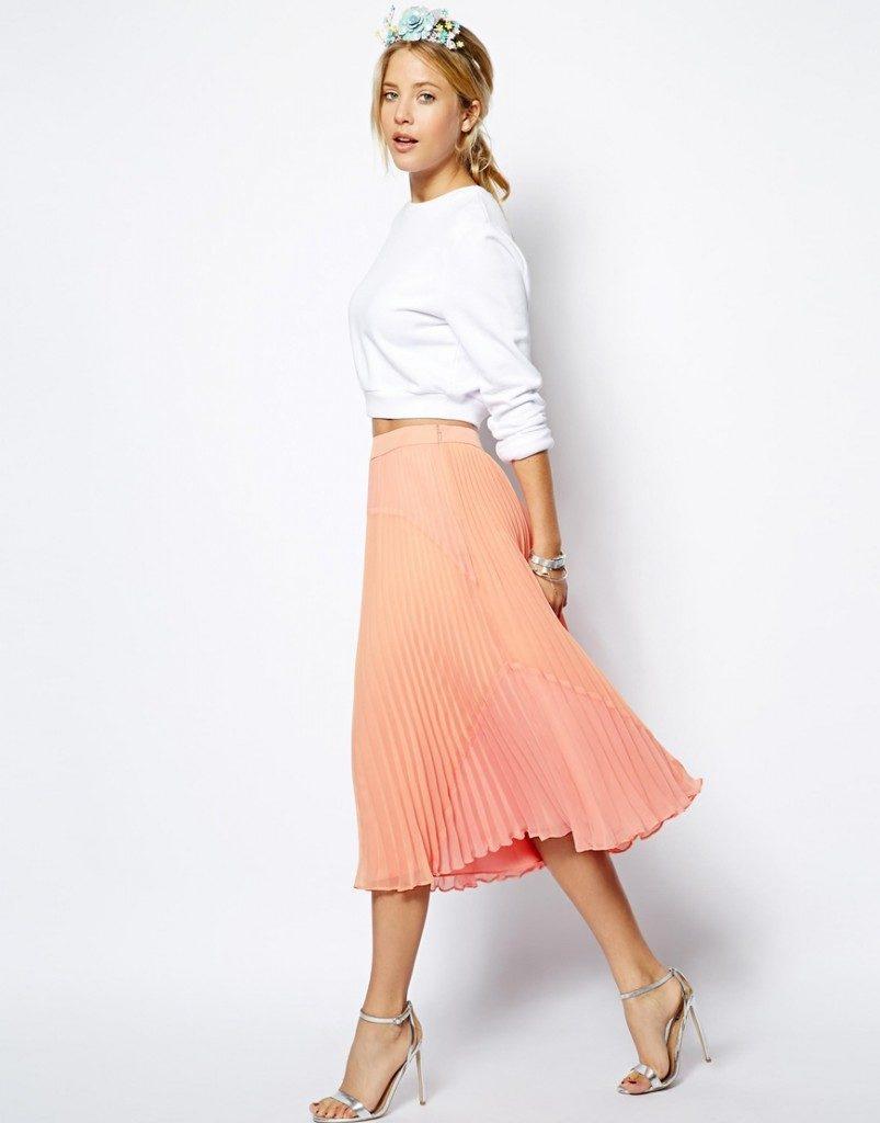 The perfect date choice - It's a pleated skirt in soft colors. Such a skirt can have any length from mini to maxi, because here the main thing is color. A colored pleated midi skirt goes well with a white top and high-heeled sandals.