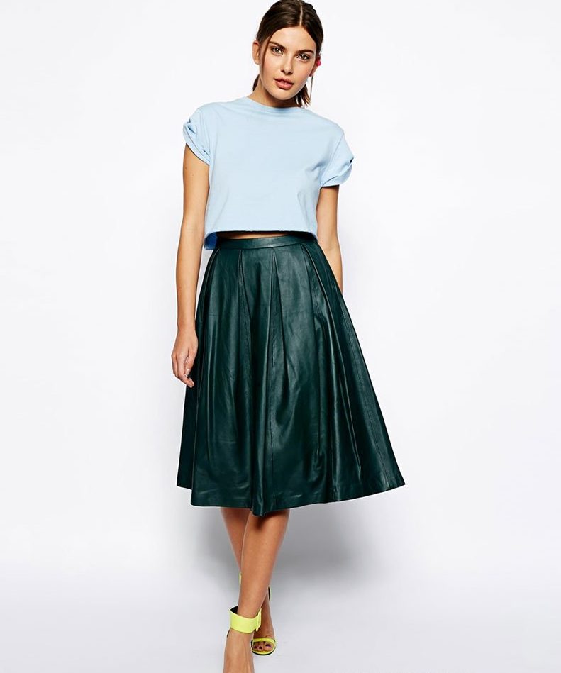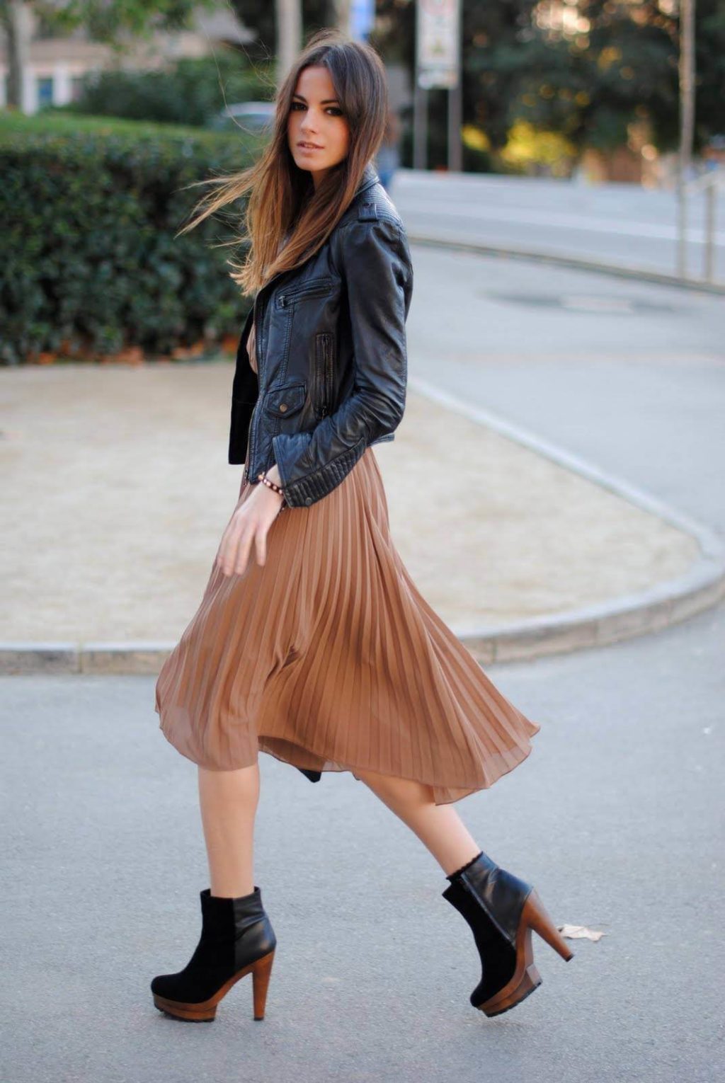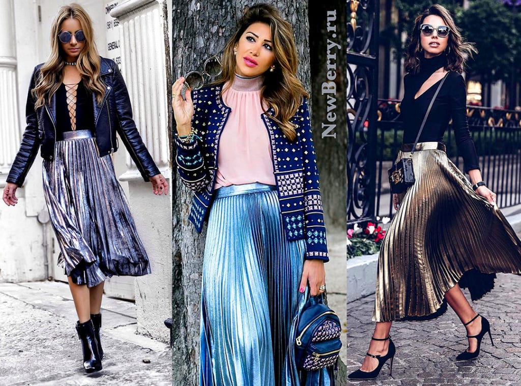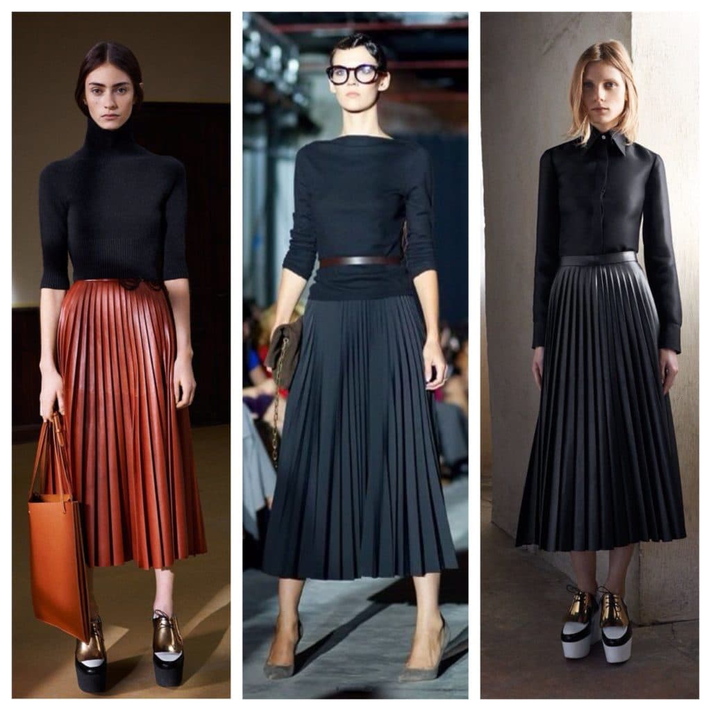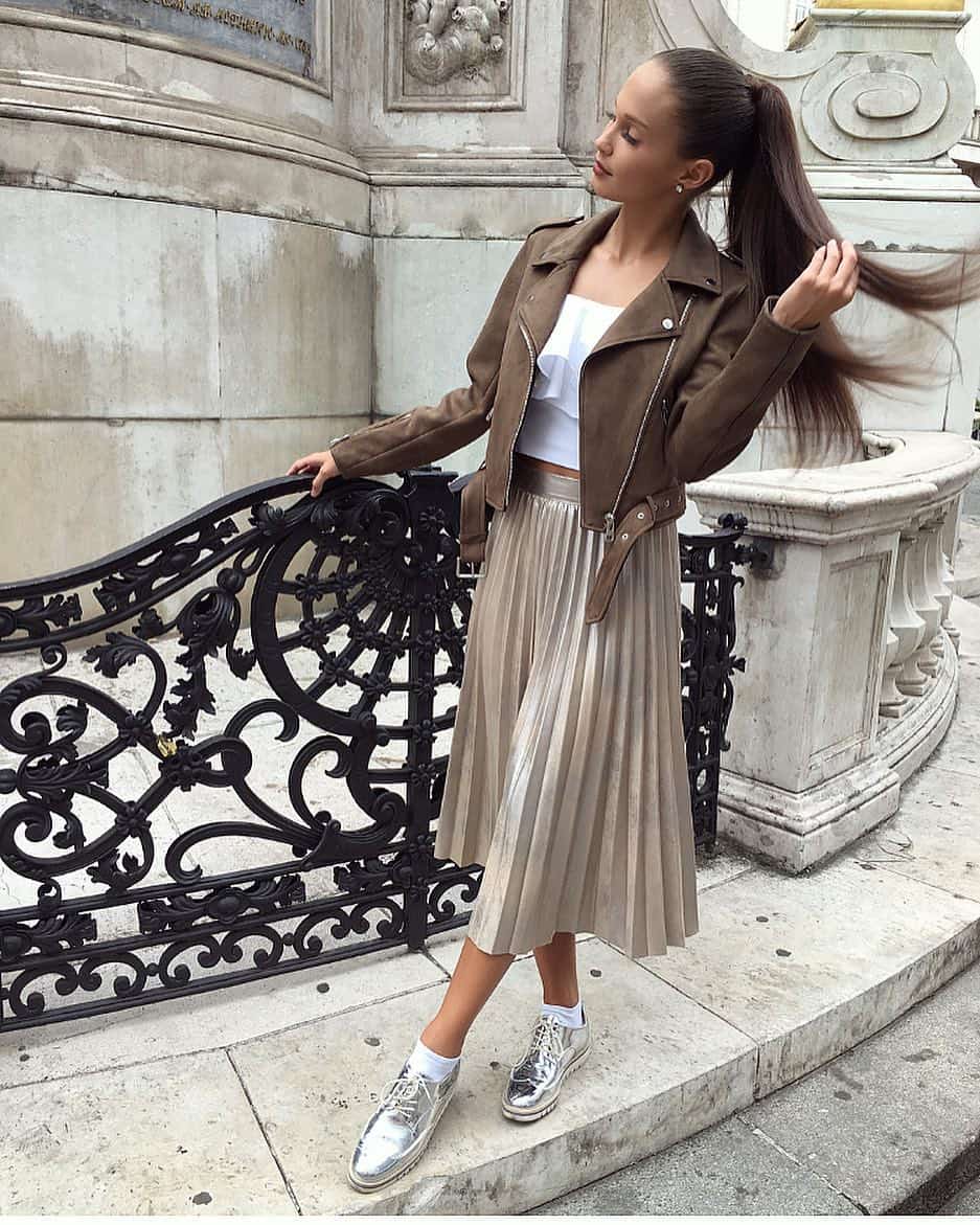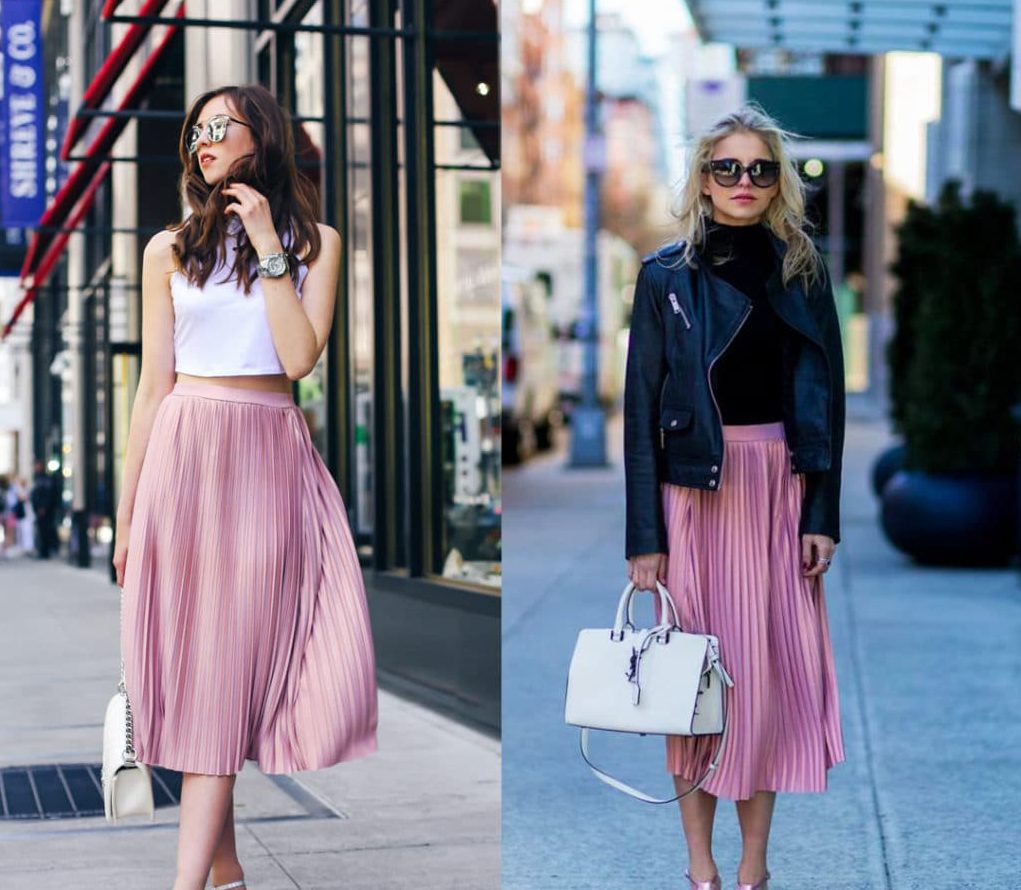A pink pleated skirt and a white tank top, complemented by a gray jacket, will be a great choice for summertime. But under the green pleated leather skirt, it is worth choosing a plain top, but picking up bright sandals.