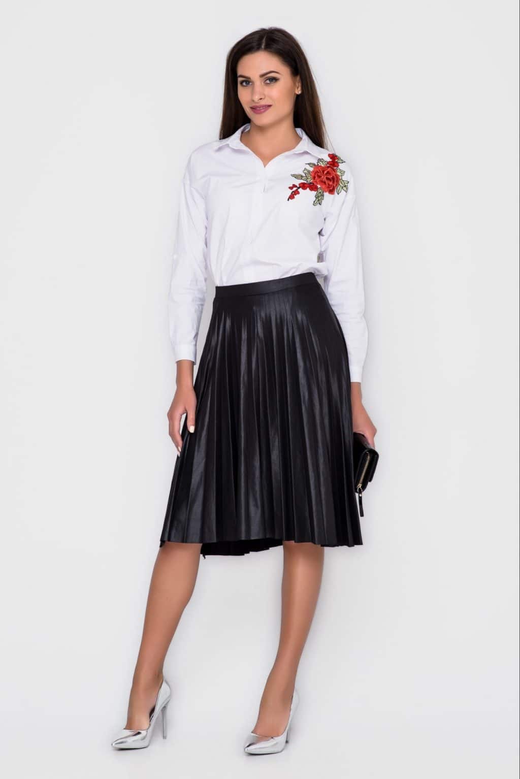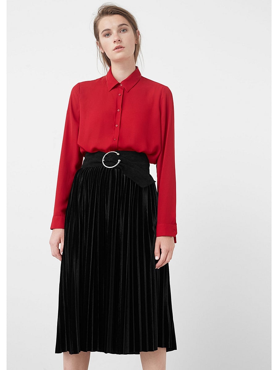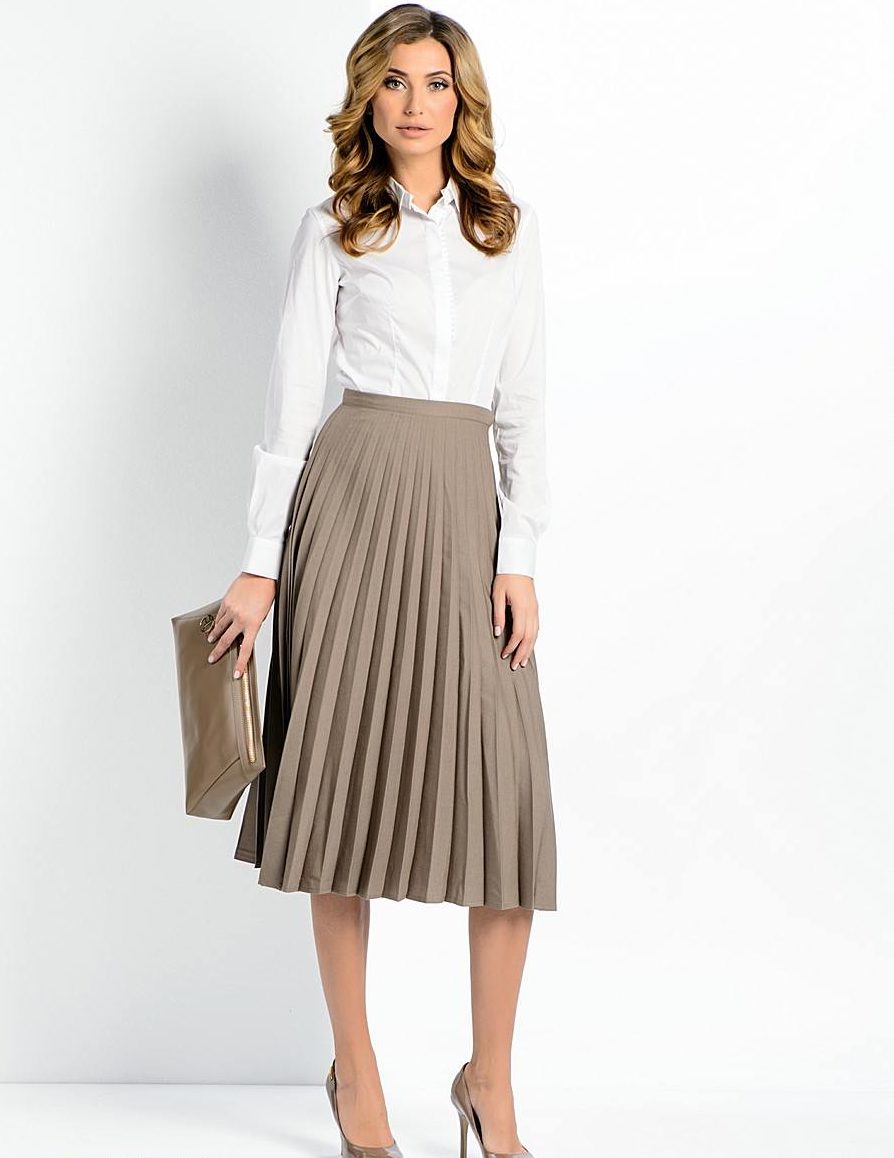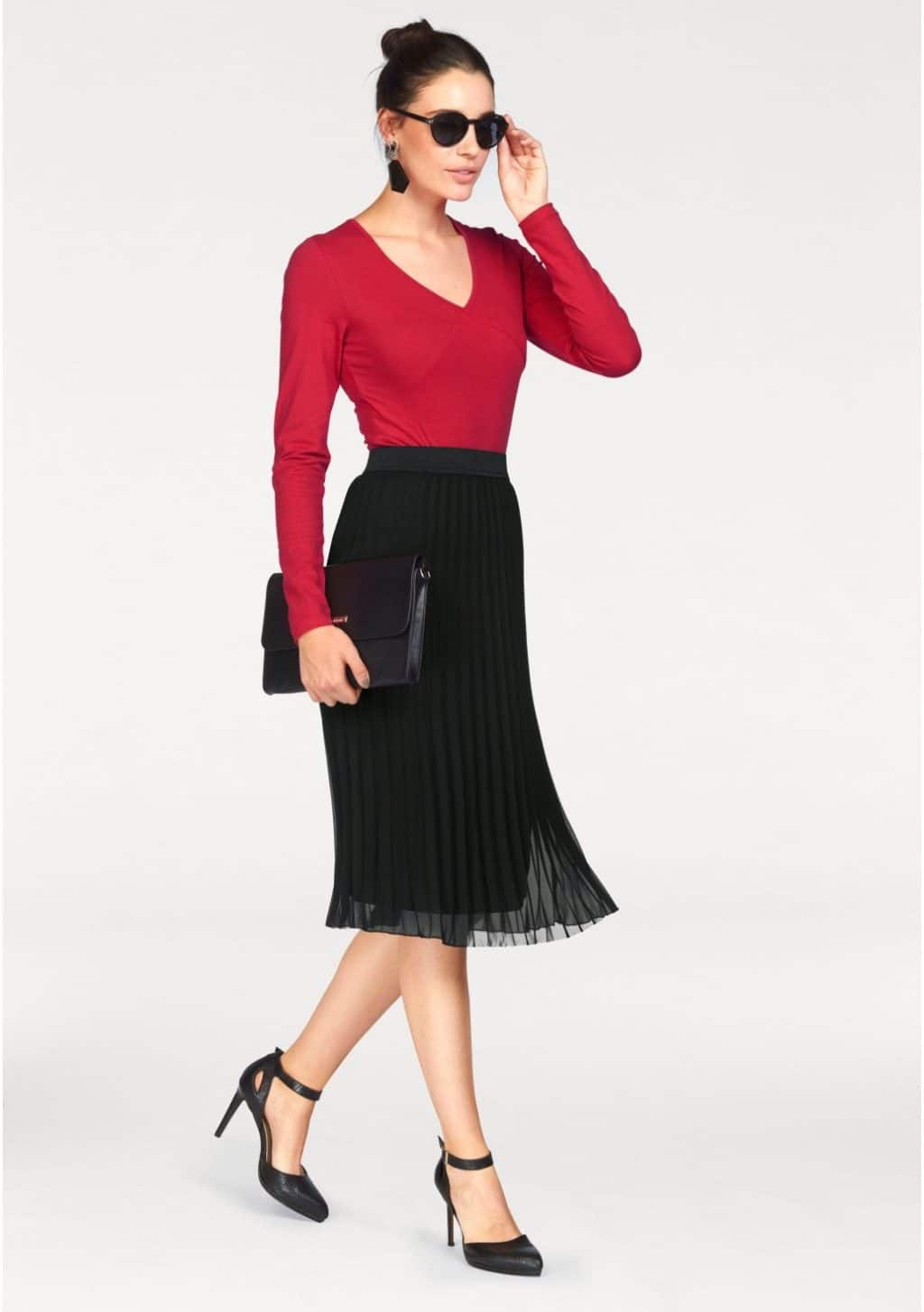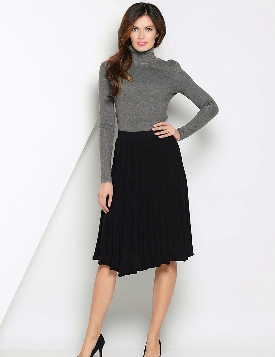 In the formation of a business image with a pleated skirt, it is always worth considering its length and of course color. The length of the skirt for the office dress code should be midi, because maxi or mini in the work environment will not look appropriate. A black pleated skirt can be combined with a red blouse, which should be tucked into the skirt itself.