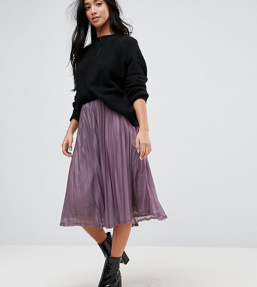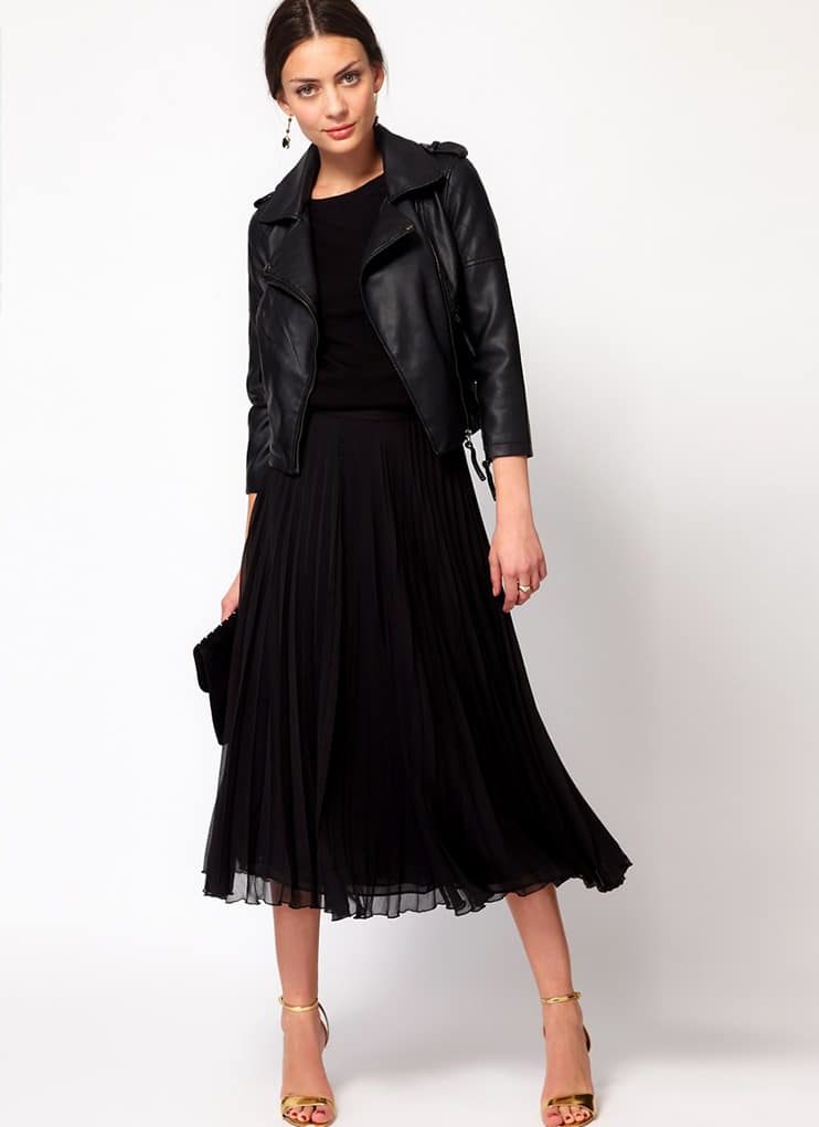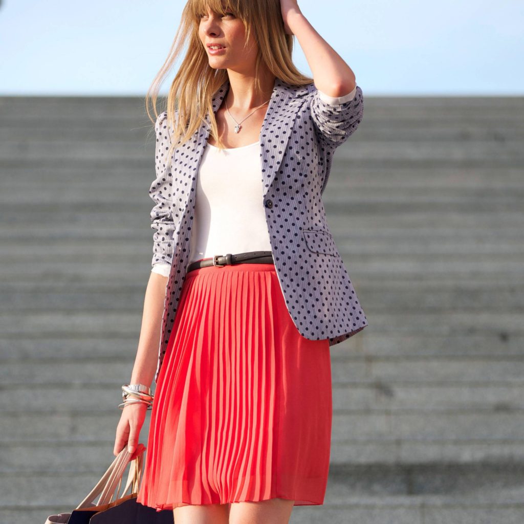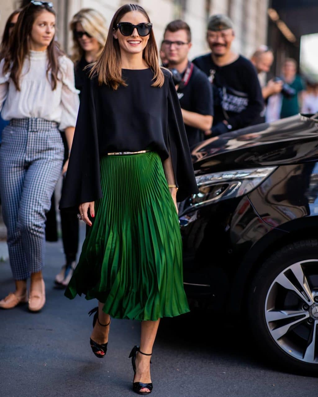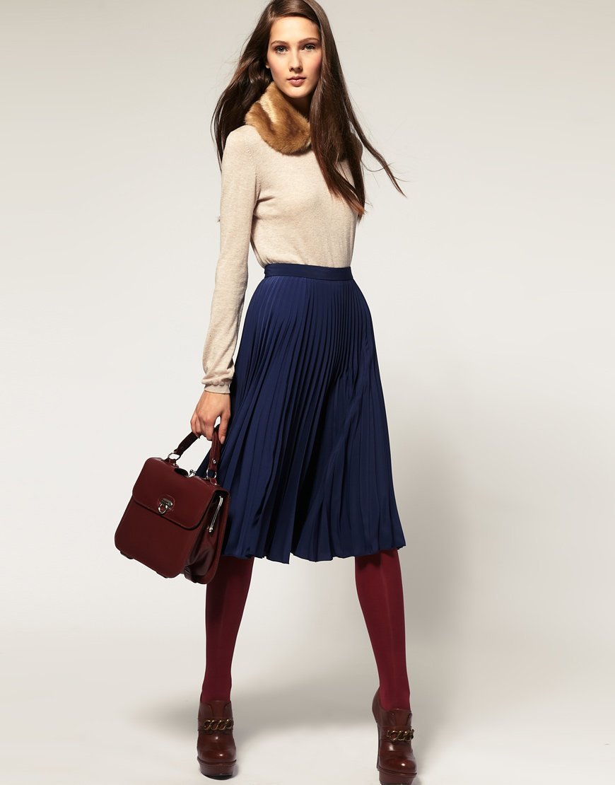 Even if your skirt will have a red or blue color, then the rest of your image should have a restrained look. Black fitted blouses, white strapless blouses, are perfect for pleated skirts.