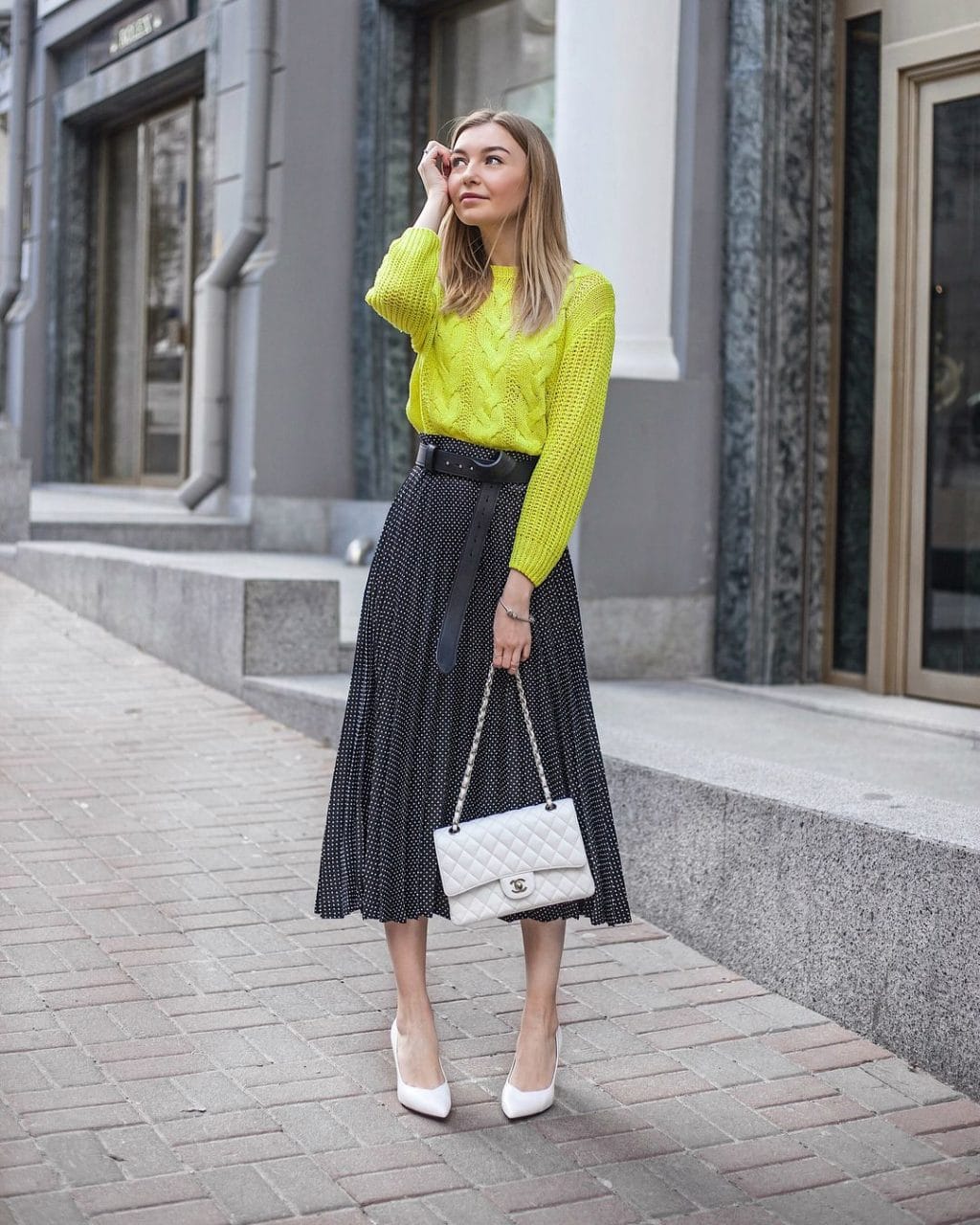 Remember that the pleated skirt has a wide, airy appearance, and to create successful images, choose a more fitted top. After all, otherwise you can achieve the effect that there are only stretched things in your wardrobe.