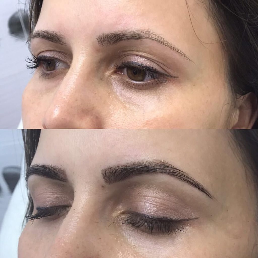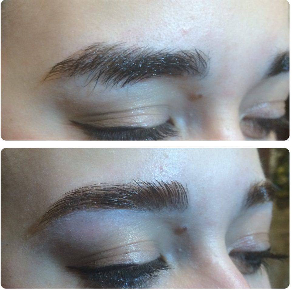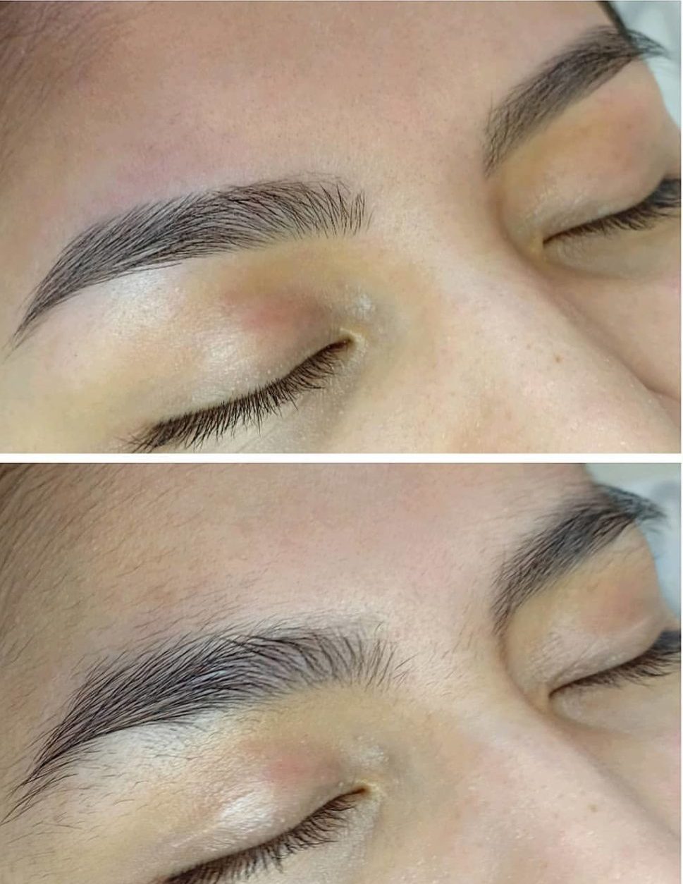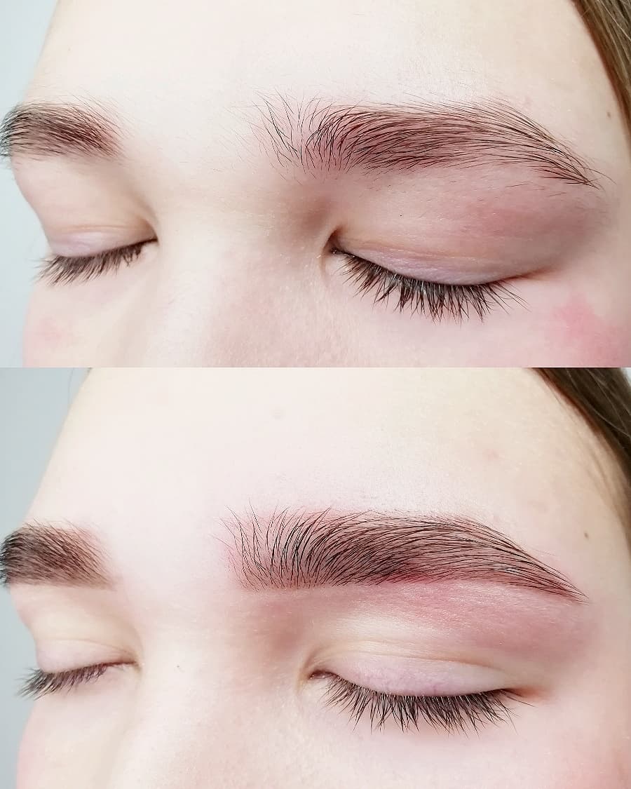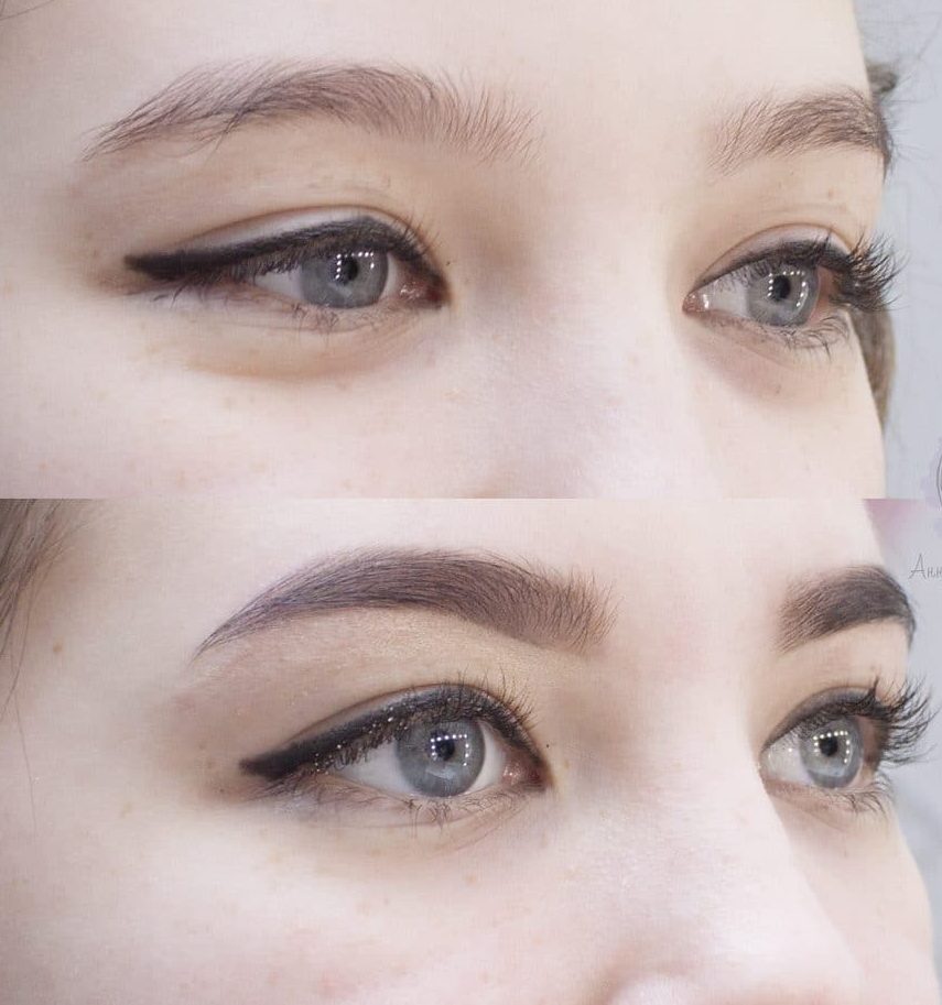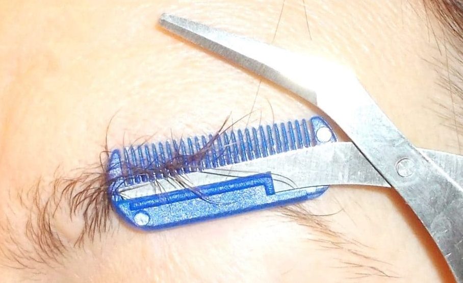 To do the haircut of the eyebrow hairs correctly, you need to comb them down, and cut the excess with a scissor. This procedure helps to remove excess density, which visually spoils the shape of the eyebrows.