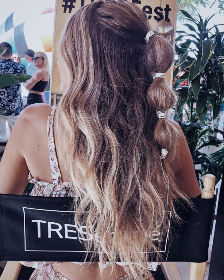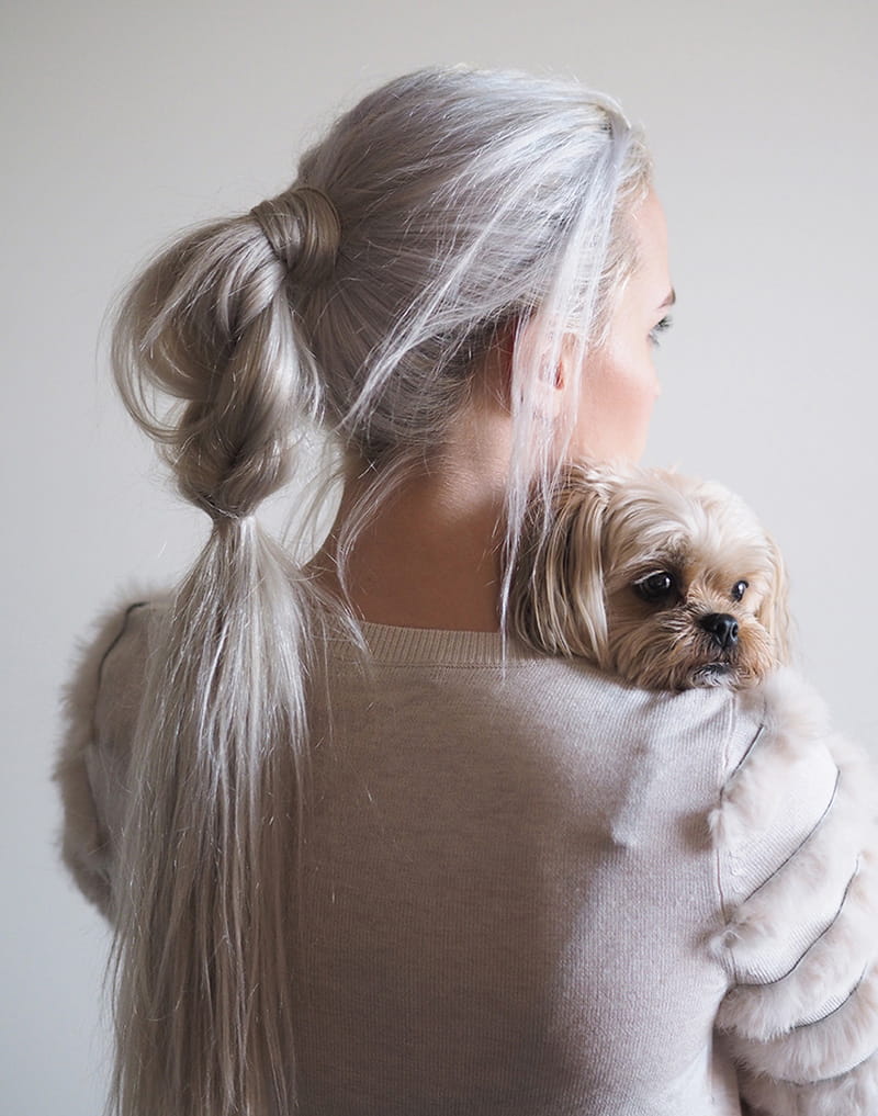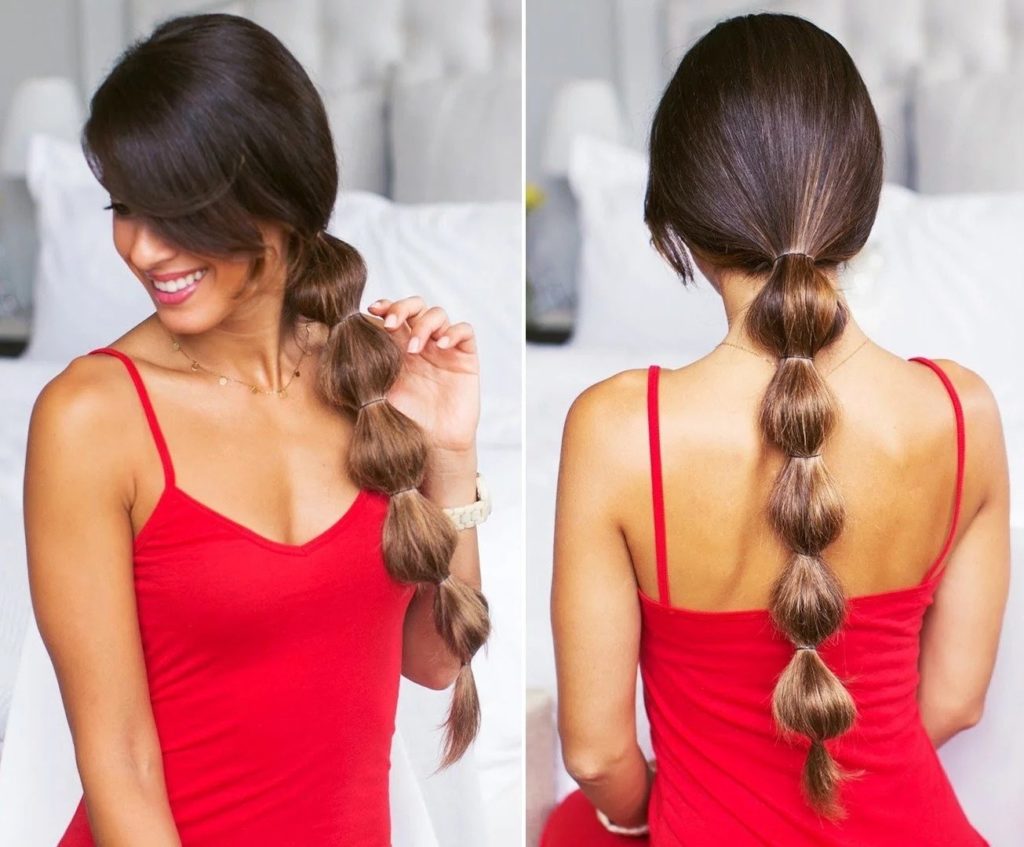 When the tail is ready, fix it at the base with an elastic band, then after 1 cm one more, and one more. How many elastic bands fit on your tail, and attach so much at the right interval. When the elastic bands are fixed, you seem to pull the intermediate hair between them, visually making them voluminous and fluffy.