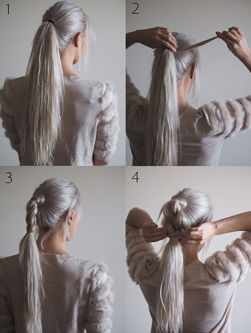 A very fast, but pretty hairstyle, suitable for both working hours and walking. Comb the hair, then tie it into a regular tail, not tightly fixing the tail with an elastic band. When the tail is tied, make a hole between the elastic and the main hair and stick your tail there. It would be like turning inside out, which would turn out to be a pretty pretty tail.