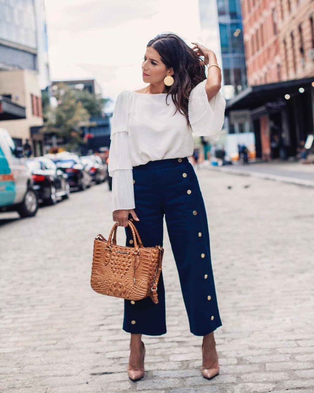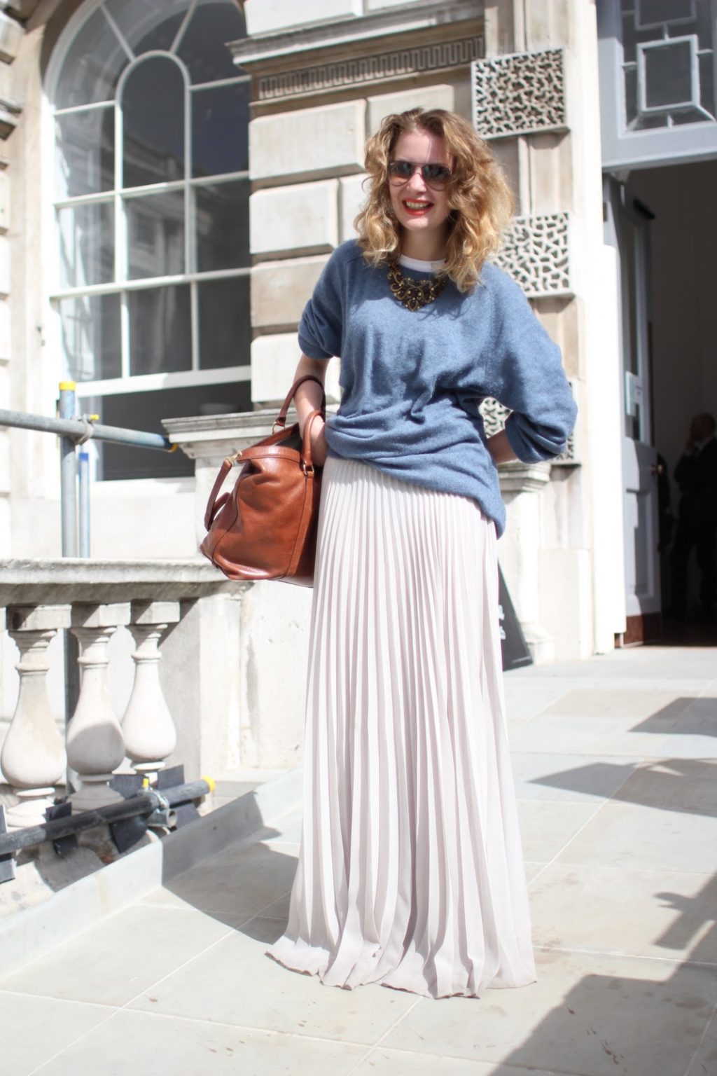 Another casual option is a combination of a brown bag with a white floor skirt and a blue sweater.