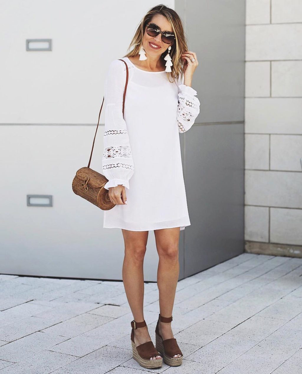 Dress of sand color with white boots with pipes in addition to a small, light brown handbag, looks elegant and sophisticated.