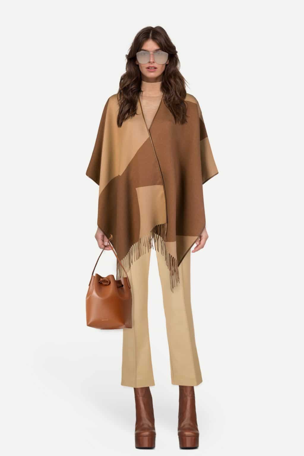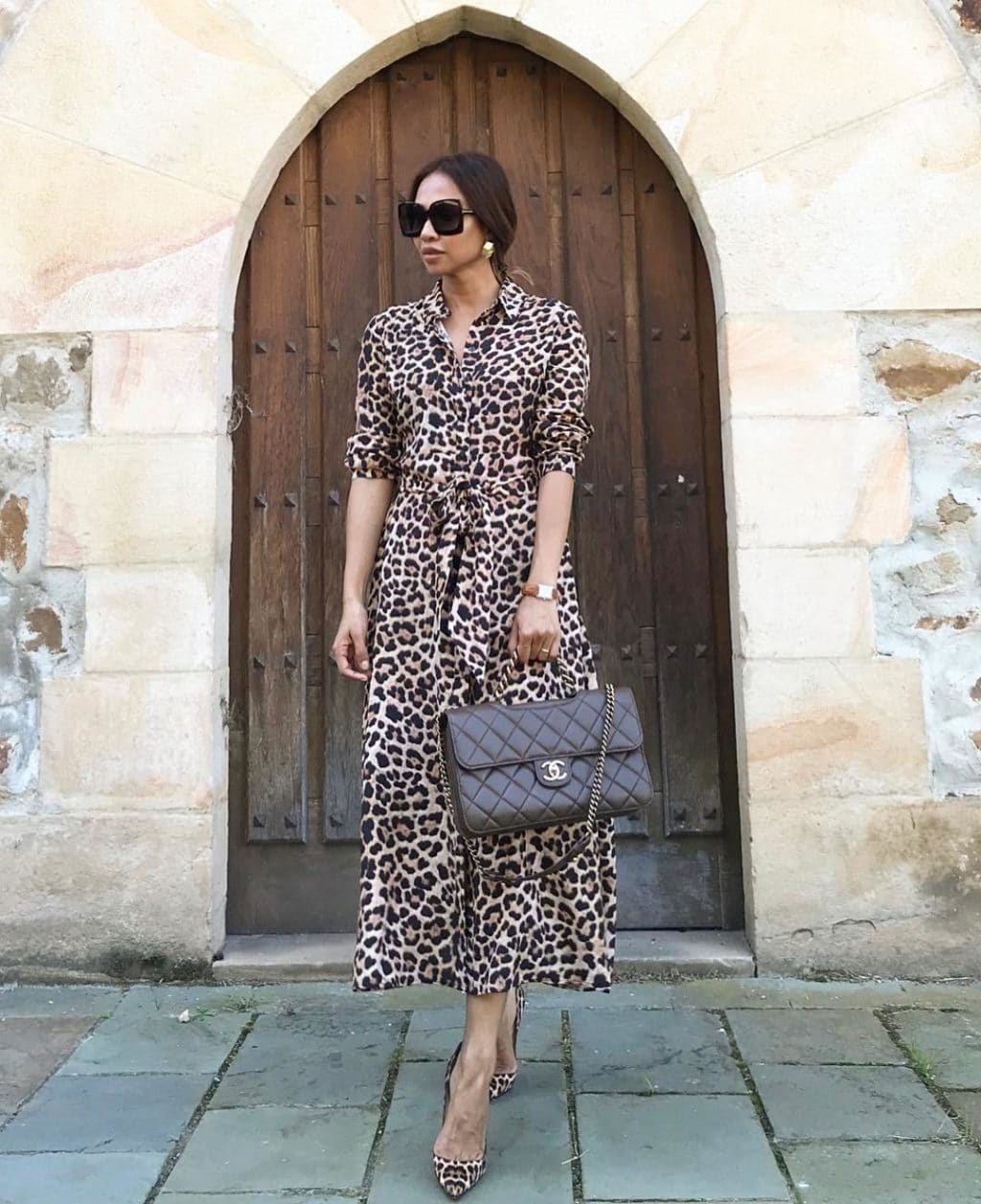 Also, wearing a brown coat with a similar tone dress, harmoniously complement your look with a caramel bag.